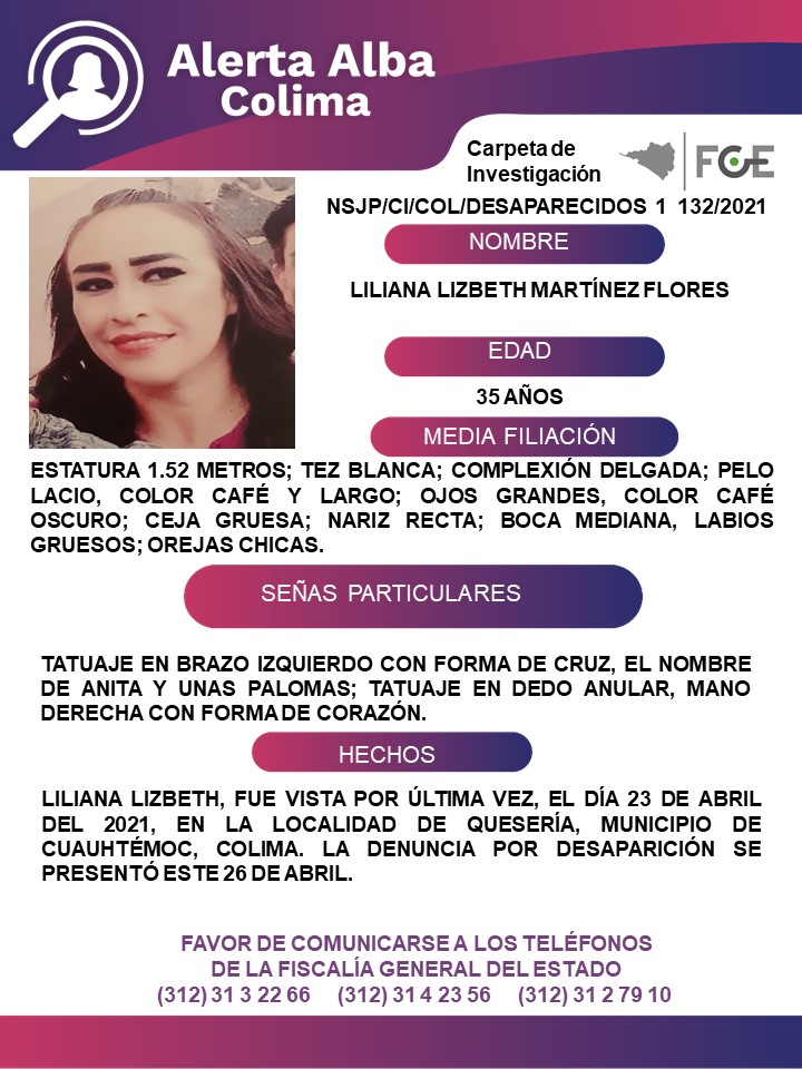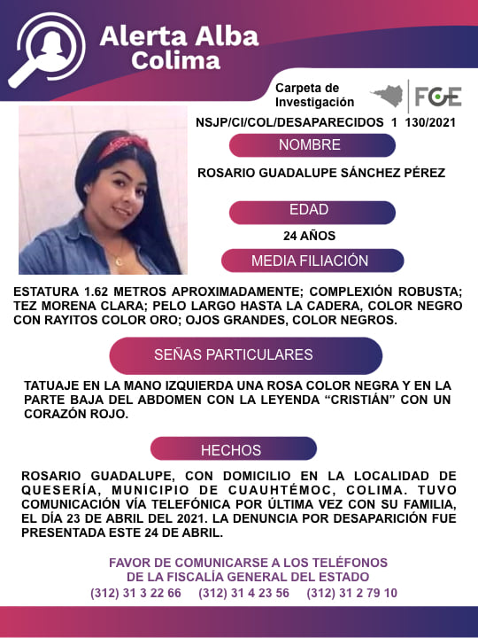 Cualquier información de su paradero favor de comunicarse a los teléfonos de la Fiscalía General del Estado (312) 3132266, (312) 3142356 y (312) 3127910. También pueden dar información en la página en Facebook de la Red Desaparecidos en Colima.