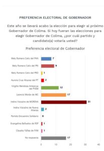 También peleando el segundo lugar se encuentra Mely Romero de la coalición “Va X Colima” del PRI, PAN y PRD. Por su parte, Virgilio Mendoza del Partido Verde tiene el 15 por ciento de los votos.