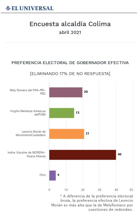 La encuesta EL UNIVERSAL/Buendía Márquez muestra que la candidata de Morena y Nueva Alianza a la gubernatura, Indira Vizcaíno, va adelante con el 40 * por ciento de los votos a favor mientras que Leoncio Morán está en segundo lugar con el 21 por ciento de votos.