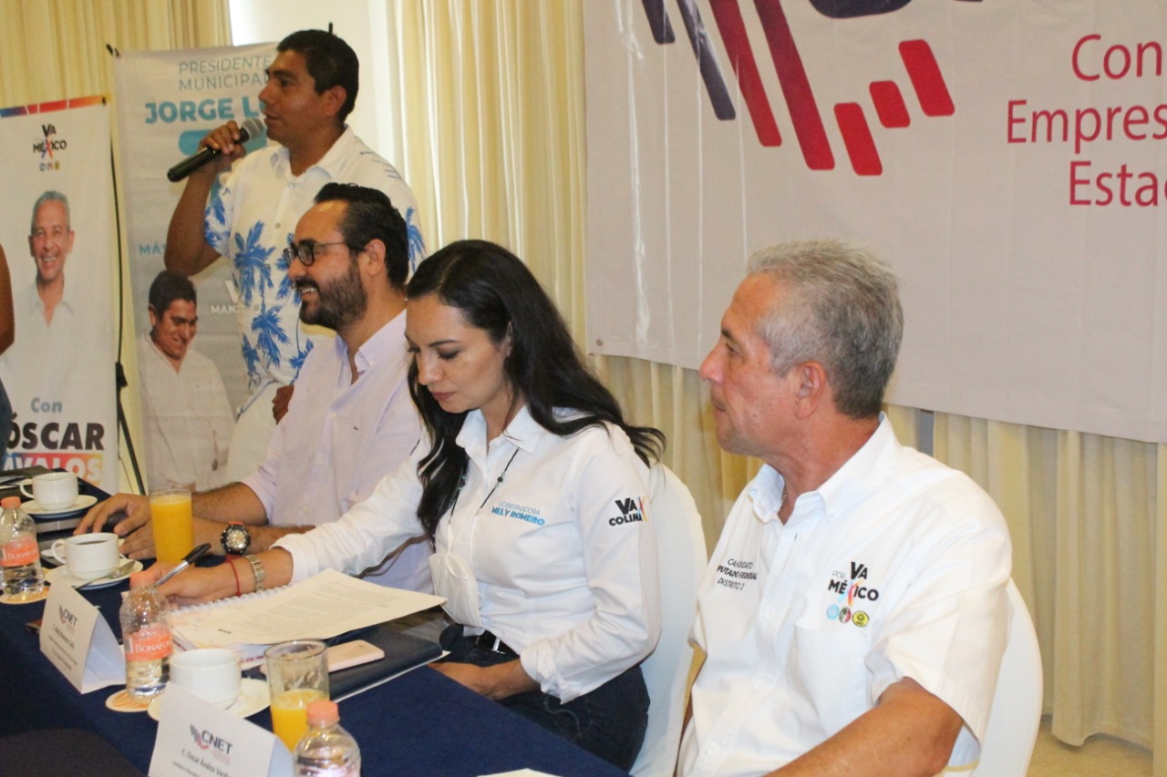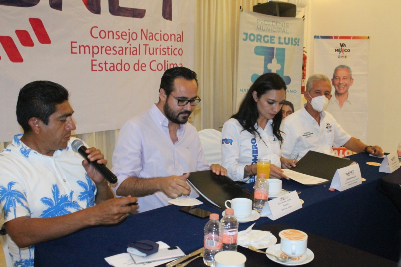 Arturo Sánchez Gordillo, presidente del Consejo Nacional Empresarial Turístico, dio la bienvenida a los candidatos de la coalición Va por Colima, Mely Romero, Jorge Luis Preciado y Óscar Ávalos, quienes fueron invitados para escuchar la problemática del sector turístico y proponer soluciones en conjunto.
