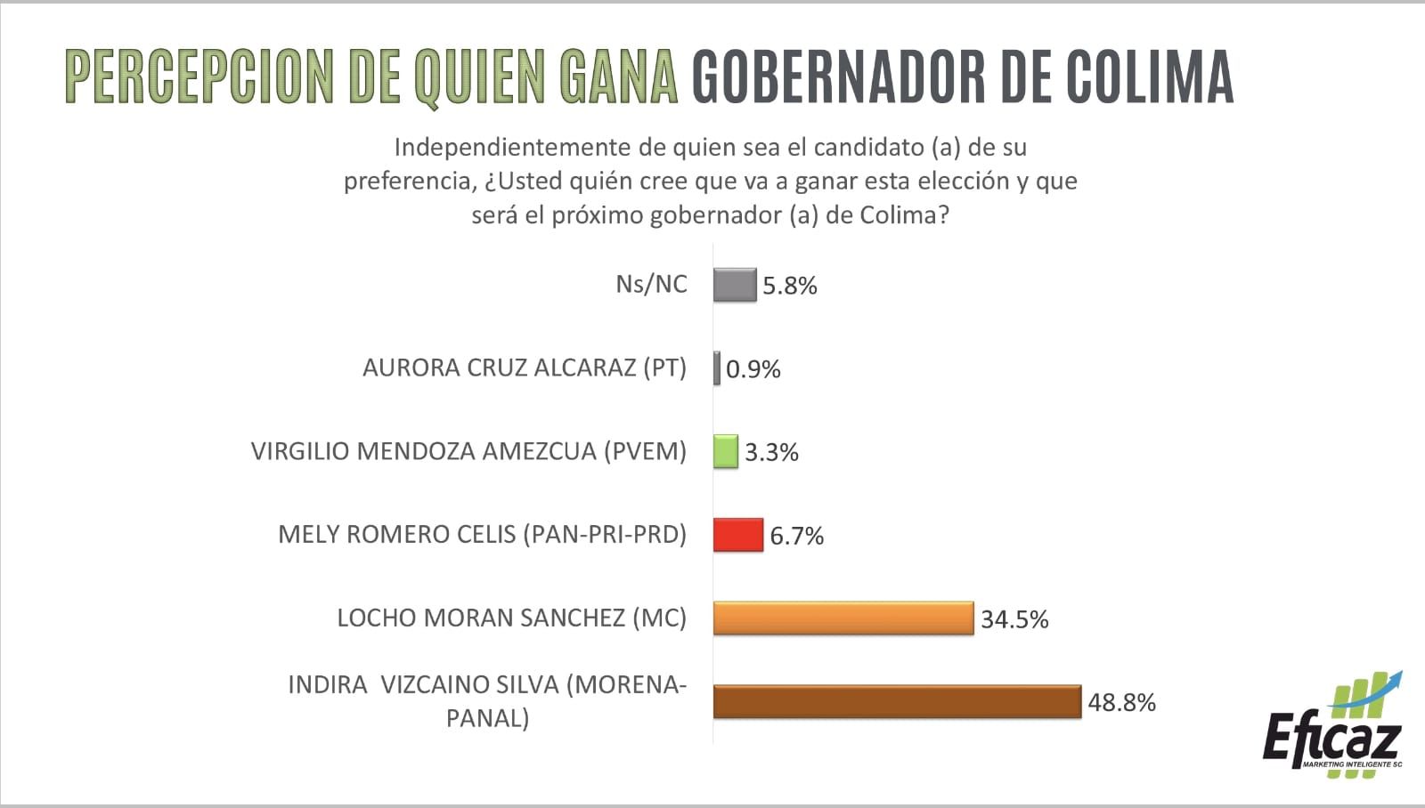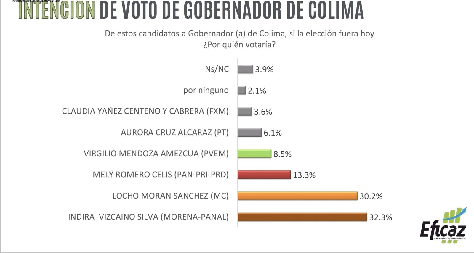 En un estudio realizado por la empresa de consultoría Eficaz Marketing Inteligente S.C. señala que el candidato de Movimiento Ciudadano Locho Morán y la candidata de Morena, Indira Vizcaíno, se encuentran prácticamente en empate técnico a una semana de que se realicen los comicios electorales el próximo seis de junio.