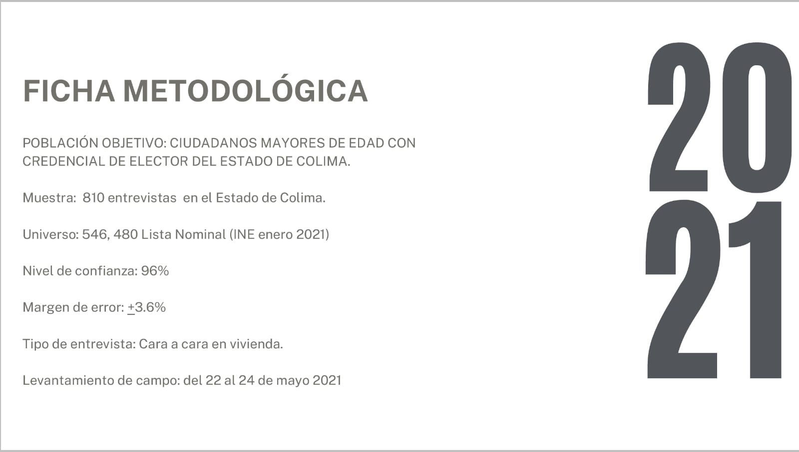 Dicho estudio se realizó del 22 al 24 de Mayo con una muestra de 810 entrevistas cara a cara con un nivel de confianza del 96% y un margen de error de más menos 3.6%; en donde los resultados obtenidos en la pregunta: Si la elección fuera hoy, ¿por quién votaría de los siguientes candidatos a gobernador? Obteniendo Indira Vizcaíno de Morena el 32.3% de la intención del voto, seguida de Locho Morán de Movimiento Ciudadano con el 30.2%, la candidata de la alianza PRI-PAN-PRD Mely Romero alcanzó un 13.3% y Virgilio Mendoza del Verde Ecologista 8.5%.