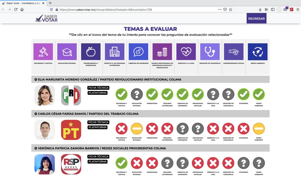 *La plataforma Saber Votar ha analizado la postura que asumen los candidatos respecto de determinados temas de interés general, considerando que la candidata de “Va por Colima” es la mejor evaluada.