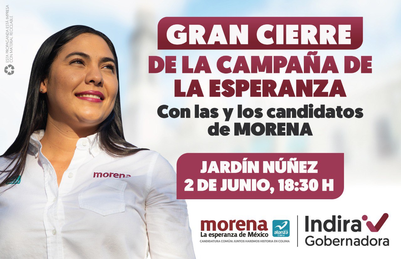 Con toda la emoción y en un ambiente de fiesta, nuestro equipo de Morena y Nueva Alianza continúa dando los últimos toques a la preparación de nuestro magno cierre de la Campaña de la Esperanza, que en algunas horas más encabezará la Candidata a Gobernadora Indira Vizcaíno, quien junto con toda la planilla triunfadora a las dos diputaciones federales, las 16 diputaciones locales y las diez alcaldías, realizaremos hoy miércoles a partir de las 6:30 de la tarde en el jardín Núñez. No te pierdas esta fiesta de la democracia y el inicio del cambio verdadero que traerá la Cuarta Transformación a Colima.