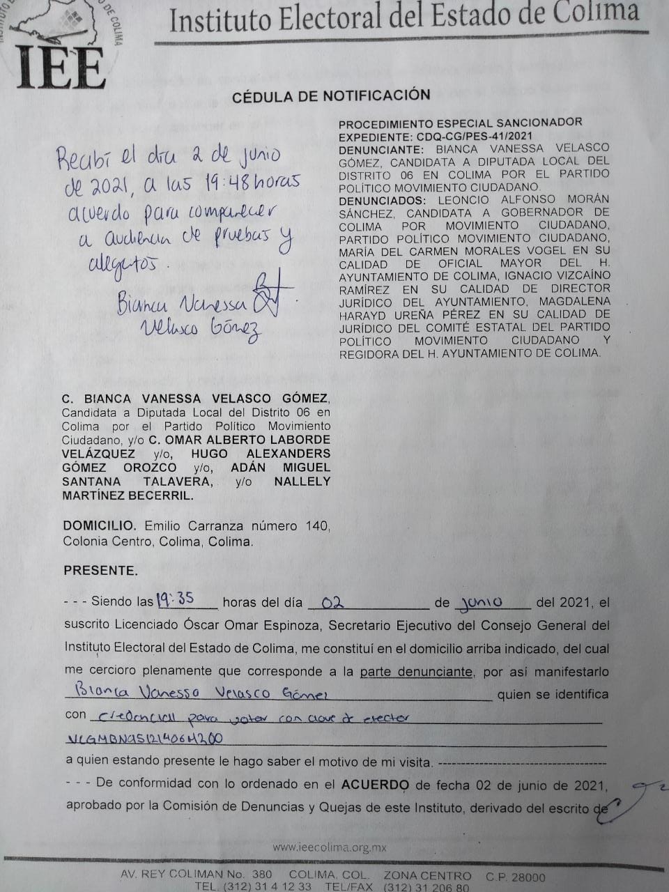 Colima, Colima a 04 de junio del 2021.- La Comisión de Quejas y Denuncias del Instituto Electoral del Estado acordó emplazar a Leoncio Morán Sánchez y Bianca Velasco Gómez, candidatos a Gobernador y Diputada Local por Movimiento ciudadano, respectivamente, a comparecer personalmente en la audiencia de pruebas y alegatos que se llevará a cabo el día 5 de junio del 2021, a las 8:00 horas, en la sede del Consejo General, ubicada en la Av. Rey Colimán #380, colonia Centro, de la ciudad de Colima.
