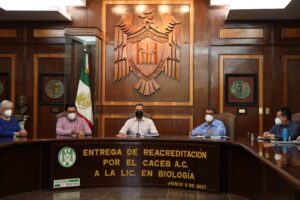 En ceremonia presencial realizada este miércoles en la sala de juntas de rectoría, el Comité para la Acreditación y Certificación de la Licenciatura en Biología, AC (CACEB), entregó una recertificación por cinco años al programa educativo en Biología de la Facultad de Ciencias Biológicas y Agropecuarias (FCBA), “por cumplir con los requisitos de calidad educativa establecidos por el CACEB”, organismo reconocido por el Consejo para la Acreditación de la Educación Superior, AC.