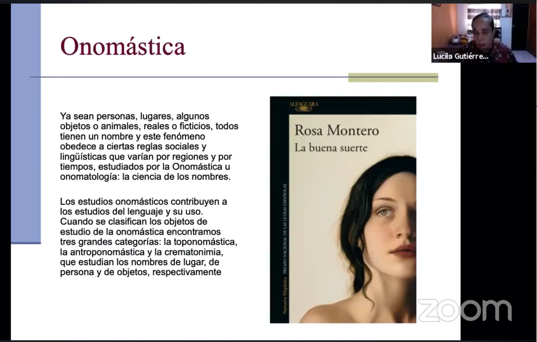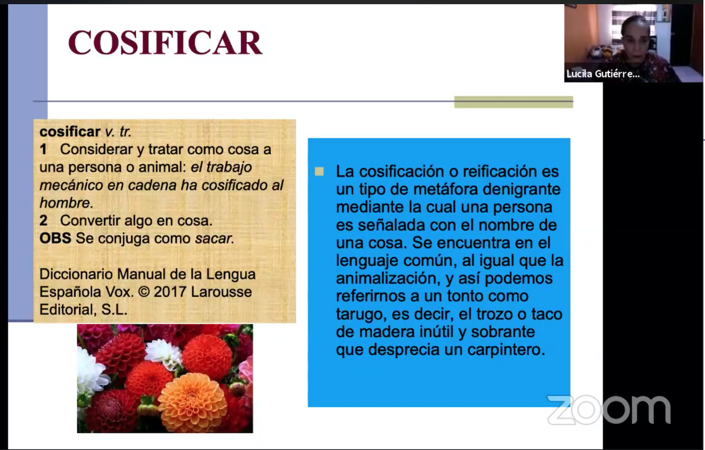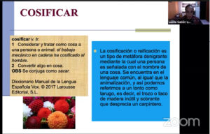 Finalmente, la investigadora señaló que existen numerosos casos de cosificación, des-personificación y animalización, con frecuencia en nombres femeninos, y que esto se puede analizar a través de las definiciones de palabras, ya sea una flor o piedra preciosa: “Al nombrar se convierten en antropónimos, pero sigue presente su origen para nombrar objetos concretos o abstractos”, aclaró.