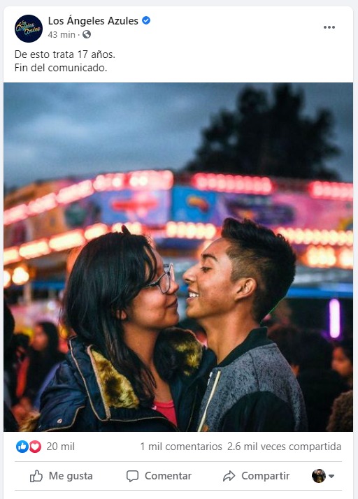 La agrupación respondió sobre el tema a través de su página de Facebook oficial, publicando una foto donde vemos a una pareja joven conformada por una mujer y un hombre, con el siguiente texto: “De esto trata 17 años. Fin del comunicado”.