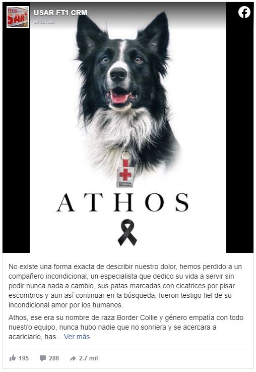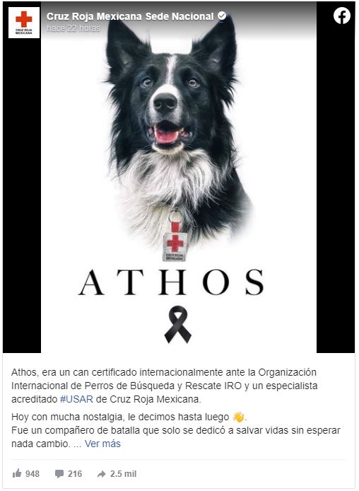 “Athos, era un can certificado internacionalmente ante la Organización Internacional de Perros de Búsqueda y Rescate IRO y un especialista acreditado USAR de Cruz Roja Mexicana. Hoy con mucha nostalgia, le decimos hasta luego. Fue un compañero de batalla que solo se dedicó a salvar vidas sin esperar nada cambio. Siempre estará en nuestros corazones”.