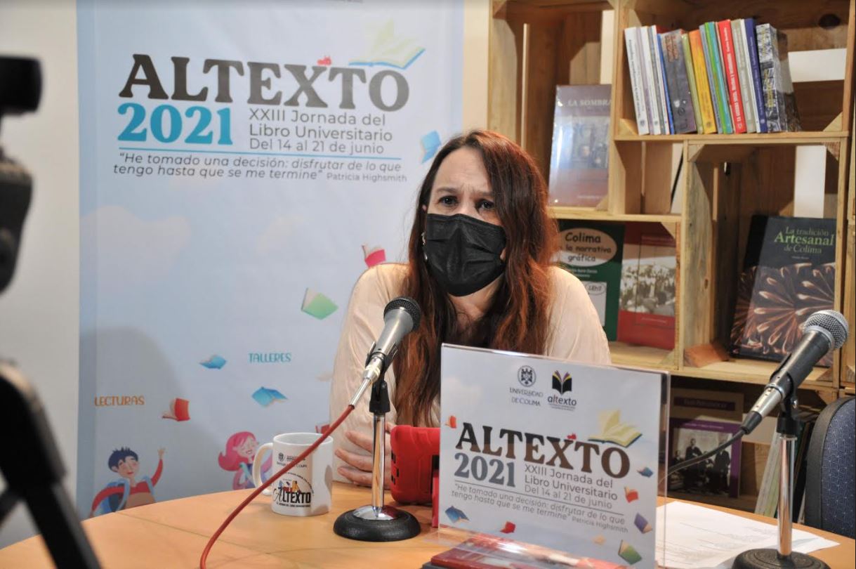Como primera actividad de la feria del libro Altexto 2021 de la Universidad de Colima, este martes la Dra. Elba Sánchez Rolón, directora del Programa Editorial de la Universidad de Guanajuato y coordinadora nacional de la Red Altexto, dictó de manera virtual, desde el estudio de Televisión Universitaria, la conferencia “Visibilidad de las publicaciones académicas: el trabajo en redes y las necesidades de diálogo con los investigadores”.