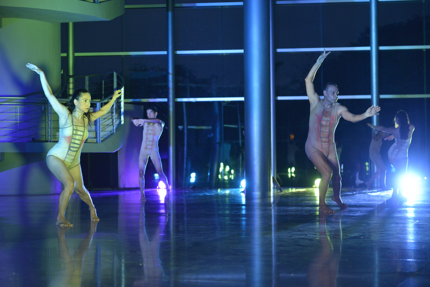 Héctor Aburto, además, ayudó con el diseño de un leotardo multiusos que vistieron las y los bailarines de esta compañía de danza contemporánea que dirigen Adriana León y Alejandro Vera. Al caer la noche, y a través de los enormes cristales que protegen al teatro, las personas que asistieron, encabezadas por el rector Christian Jorge Torres Ortiz Zermeño, sentadas en el exterior y bajo un cielo nublado, disfrutaron esta presentación en la que hubo