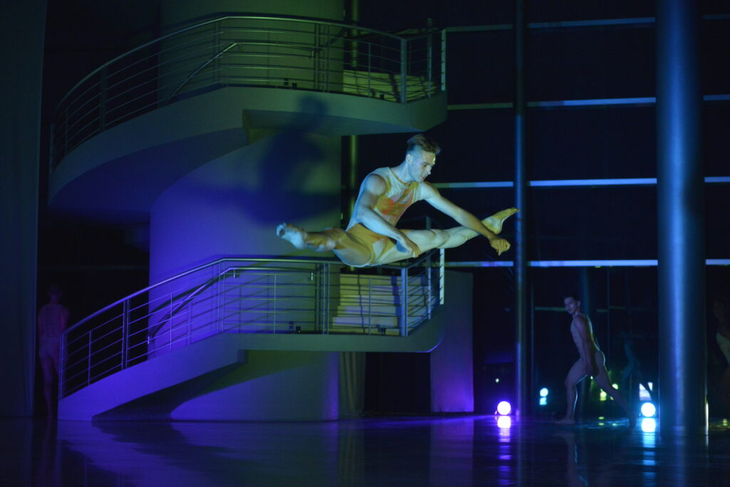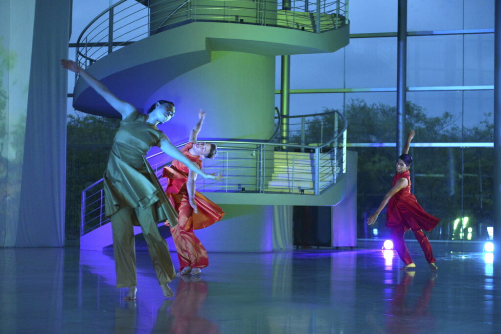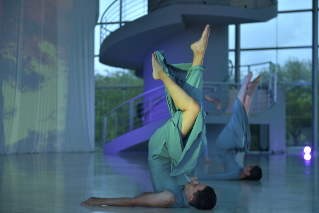 Luego de un año de estar alejados de los escenarios debido a la contingencia sanitaria, Univerdanza regresó con una puesta en escena que montaron en el vestíbulo del Teatro Universitario y en la que utilizan la escalera que lleva al segundo piso, así como las columnas, para realizar sus coreografías, además de danzar frente a un enorme telón de fondo en el que se proyectaron todo el tiempo imágenes generadas por Helio Santos mediante fórmulas y procesos matemáticos.