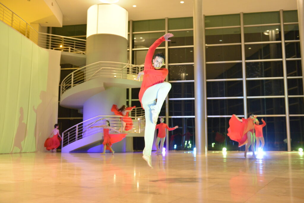 colores, música y movimientos estilizados. Apreciaron, durante casi una hora, las sombras que se movían frente al telón, los cuerpos girando, saltando, expresándose con gestos que decían más que las palabras. Una vez terminada la presentación, el rector pasó al vestíbulo a felicitar a los integrantes de esta compañía y a reconocer el valor de los médicos y enfermeras que siguen contribuyendo, con su trabajo cotidiano, a combatir la COVID-19.