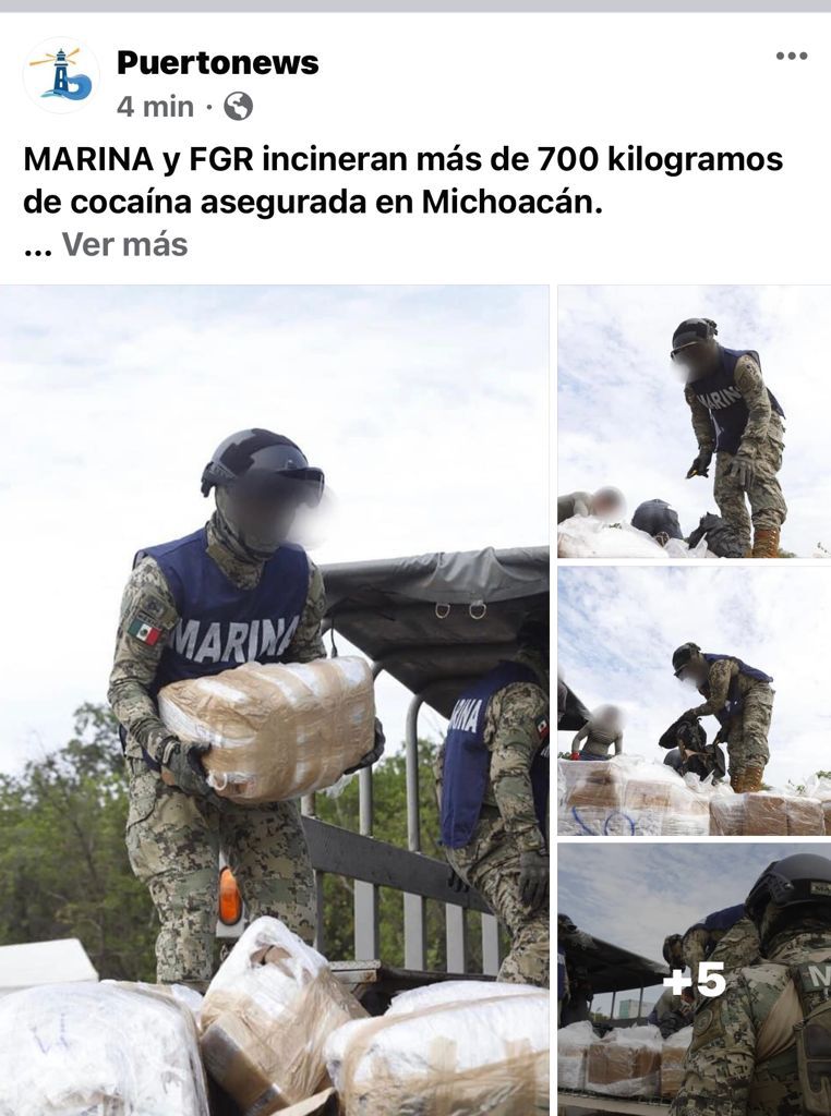 La Secretaría de Marina-Armada de México y la Fiscalía General de la República (FGR), en el marco del Plan Nacional de Paz y Seguridad 2018-2024, informan que el día de ayer se llevó a cabo en las instalaciones de la Sexta Región Naval, la incineración de 731.2 (setecientos treinta y uno punto dos) kilogramos peso bruto de clorhidrato de cocaína, la cual venía contenida en 611 (seiscientos once) paquetes y que fue asegurada en inmediaciones de la playa de Boca de Apiza, en las costas del Estado de Michoacán, la cual era transportada en una embarcación menor con dos motores fuera de borda.