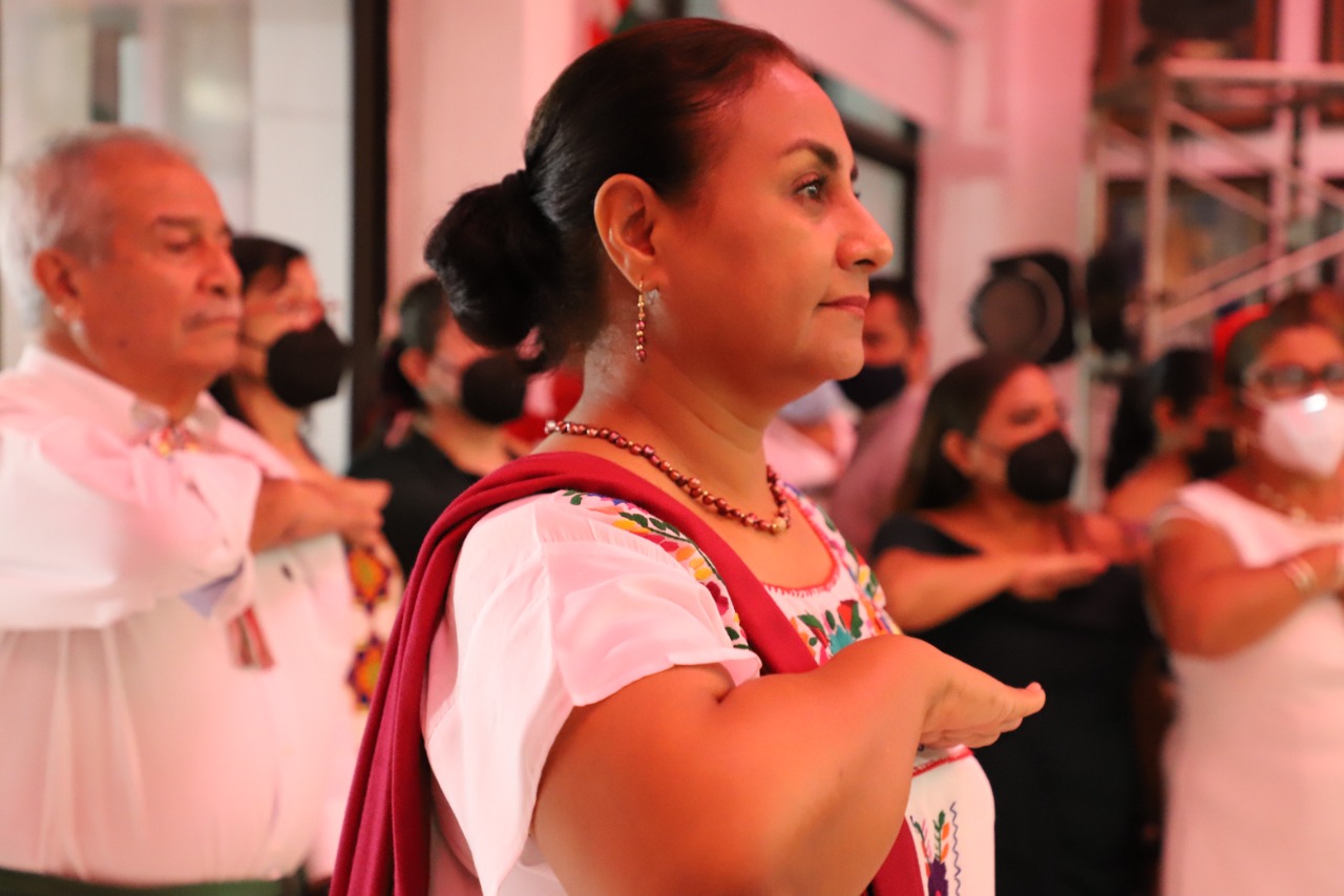 mandataria municipal hizo repicar la campana de Dolores y ondeó la bandera, para luego entonar el Himno Nacional.