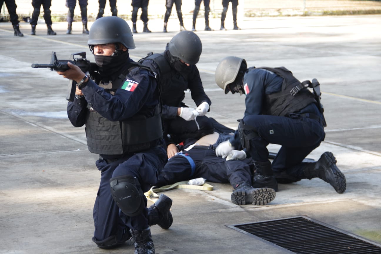Ante las autoridades presentes, familiares y amigos, los cadetes egresados realizaron una demostración de reacción a una emboscada, medicina táctica, rosa de fuego y extracción en conato de riña en centros penitenciarios.