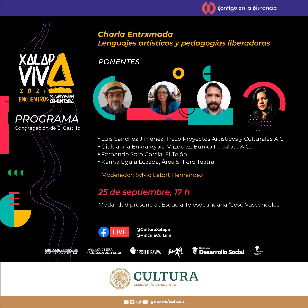 El sábado 25 de septiembre, a las 17:00 horas, el programa Cultura Comunitaria de la Secretaría de Cultura federal, participará en Xalapa Viva. Encuentros de participación comunitaria 2021 con la charla, presencial y virtual, “Lenguajes artísticos y pedagogías liberadoras” en la cual se dialogará sobre las diversas técnicas de intercambio de saberes y las formas de mediación cultural para la transformación positiva de comunidades.