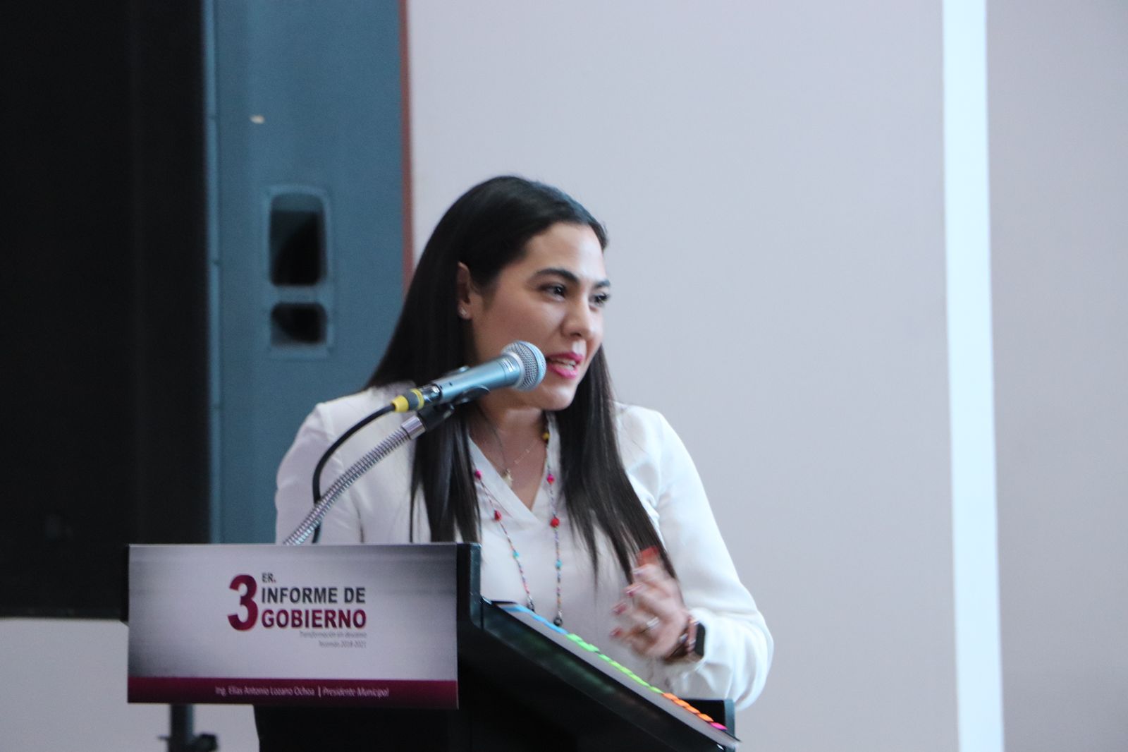 Presente en el mensaje especial que realizó el presidente Elías Lozano una vez concluida la Sesión Solemne de este tercer informe, la gobernadora electa de Colima, Indira Vizcaíno, expuso en un breve mensaje que en el municipio tecomense “hay un antes y un después” de esta administración, agregando que se ha reflejado “la visión de los gobierno se la Cuarta Transformación, con austeridad, con amor por su tierra” y la estabilización de las finanzas.