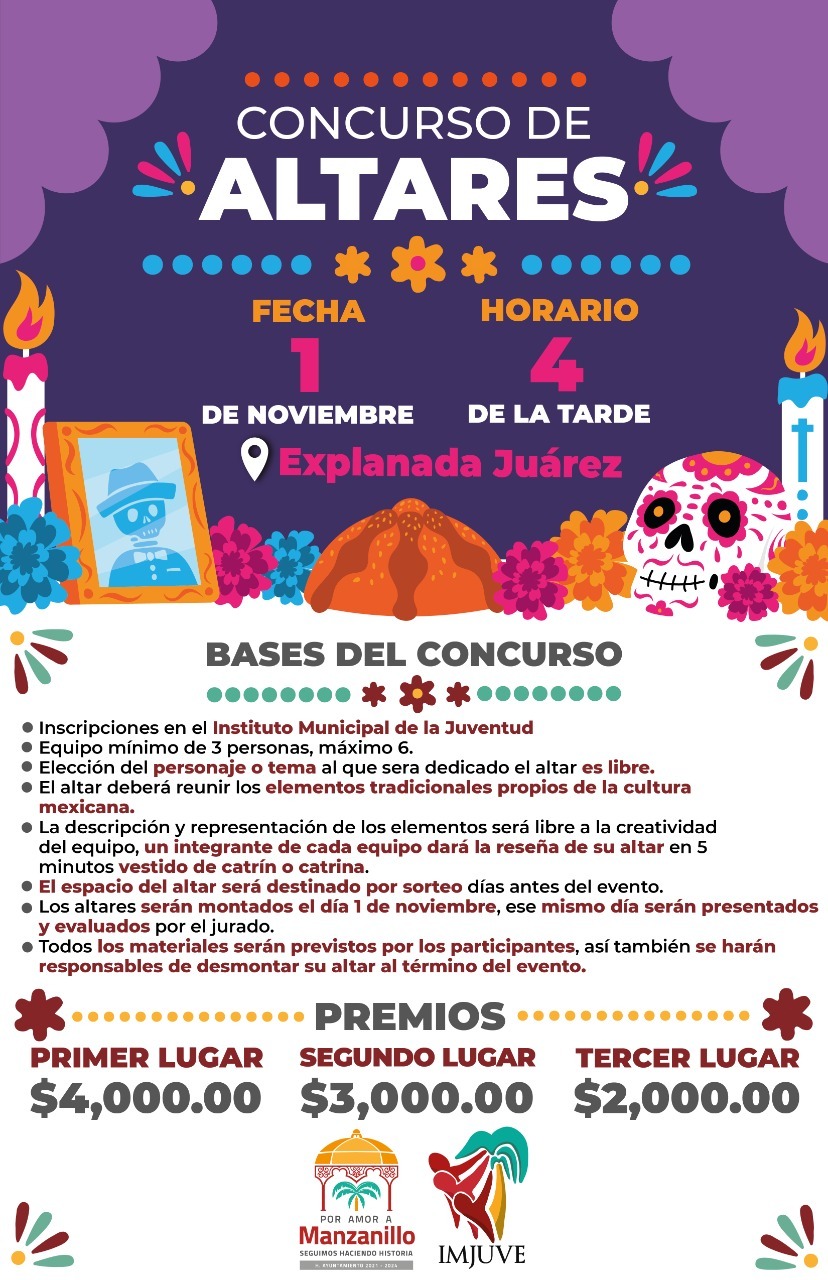 La comuna manzanillense también invita al Concurso de Altares este 01 de noviembre a las 4 de la tarde en la Explanada Juárez, podrán participar equipos de entre 3 y 6 personas, y deberán inscribirse en el Instituto Municipal de la Juventud; cada altar deberá reunir los aspectos tradicionales de la cultura mexicana y un integrante del equipo deberá dar la reseña en 5 minutos caracterizado de catrina o catrín, éstos serán evaluados por un jurado, el ganador del primer lugar obtendrá 4 mil pesos, el segundo 3 mil y le tercer lugar 2 mil pesos.