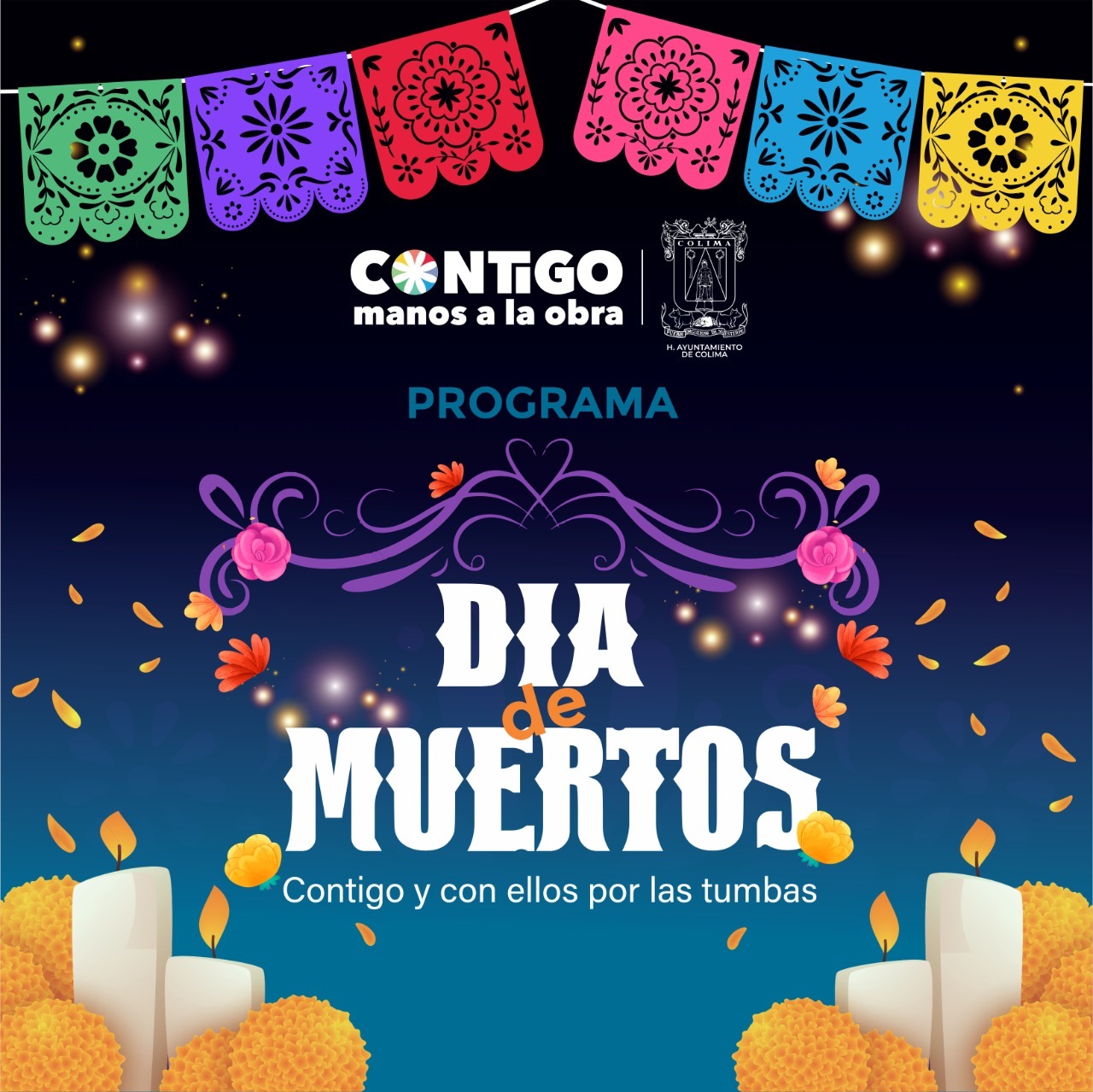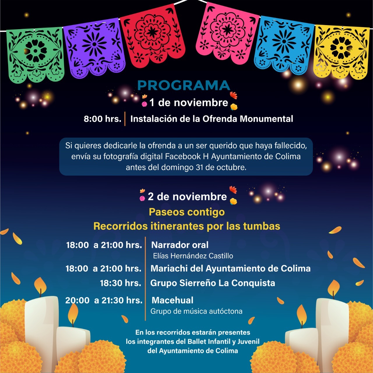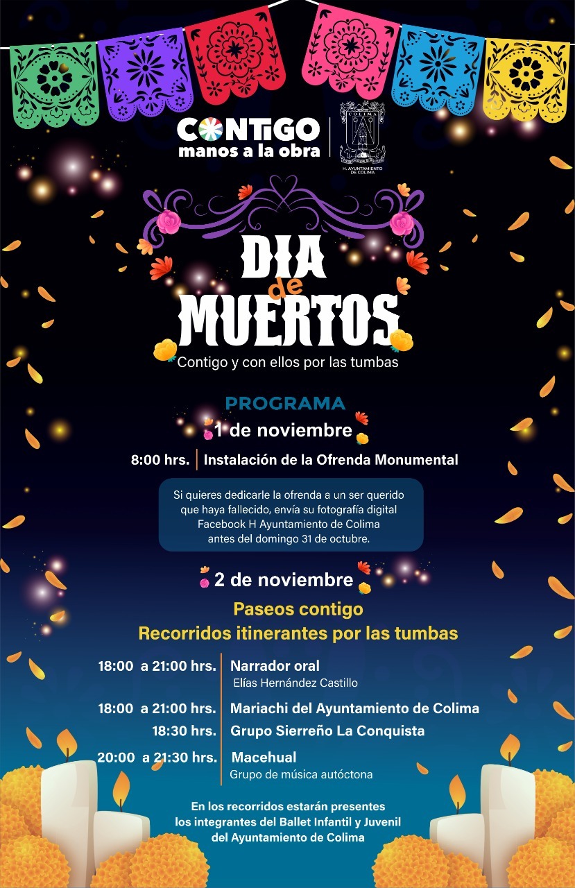 Puntualizó que las actividades culturales iniciarán el 1 de noviembre, a las ocho de la mañana, cuando se oficializará la instalación de Ofrenda Monumental, por lo que invitó a la población a enviar una fotografía digital de su ser querido fallecido vía mensaje privado a la página oficial de Facebook H Ayuntamiento de Colima.