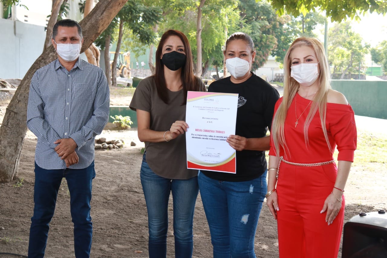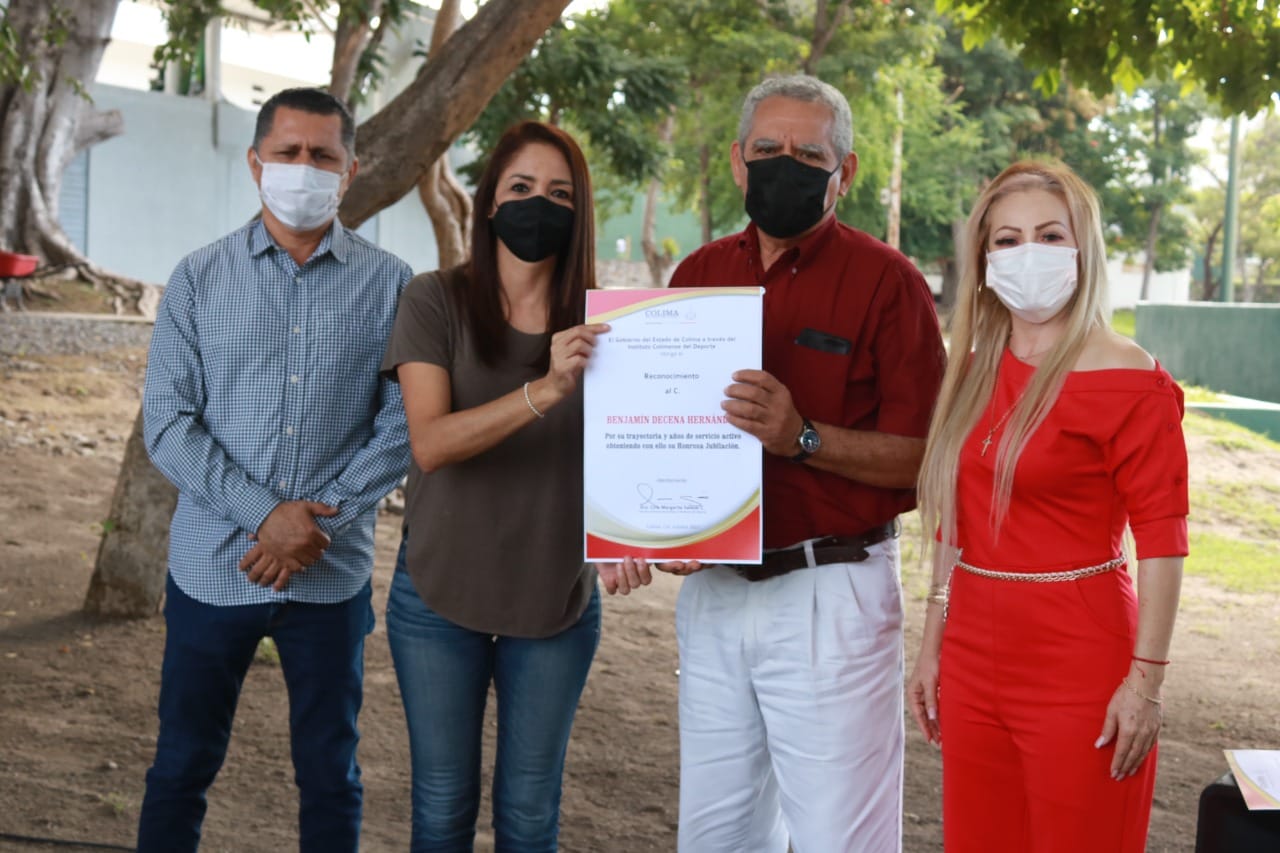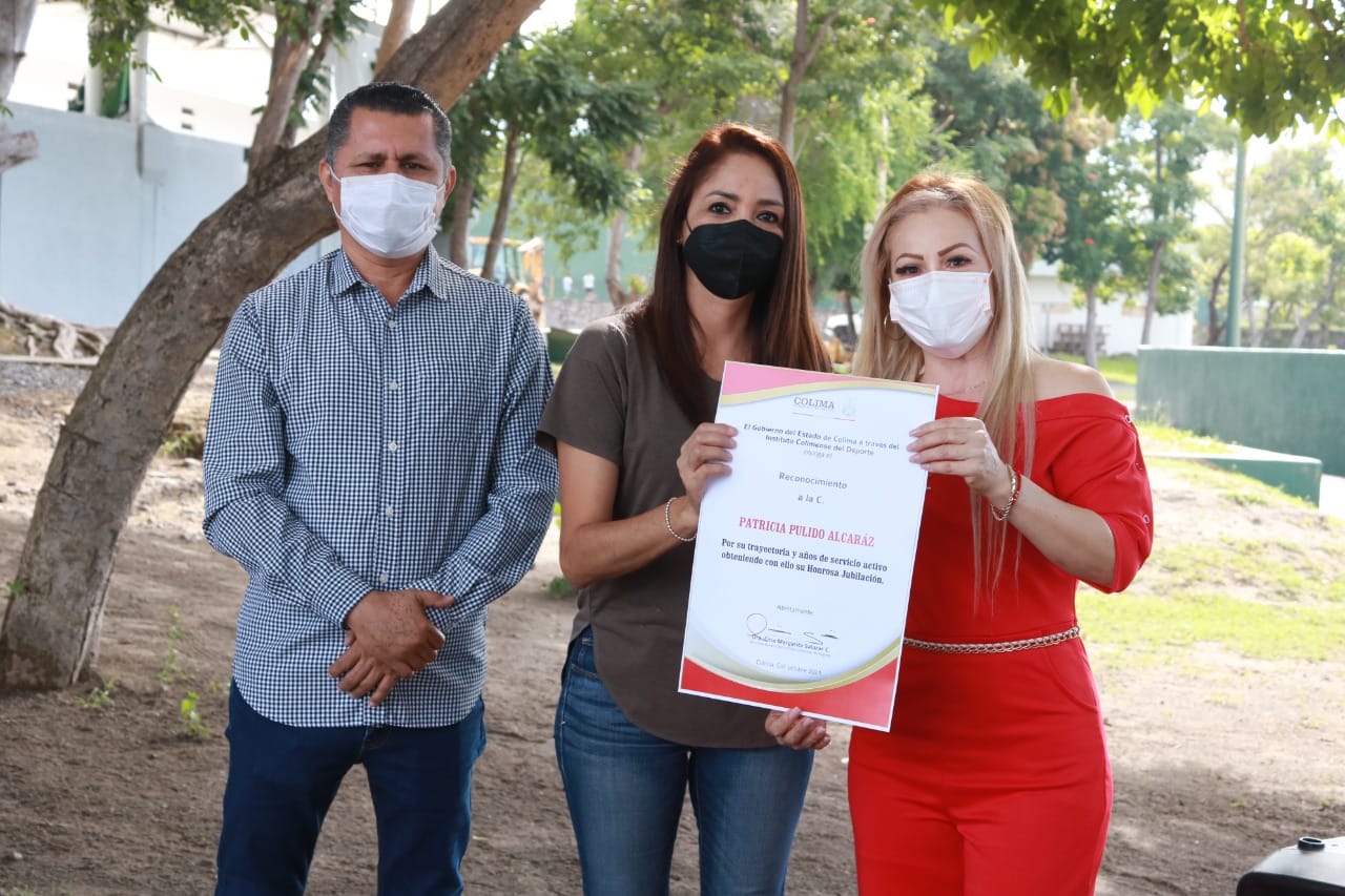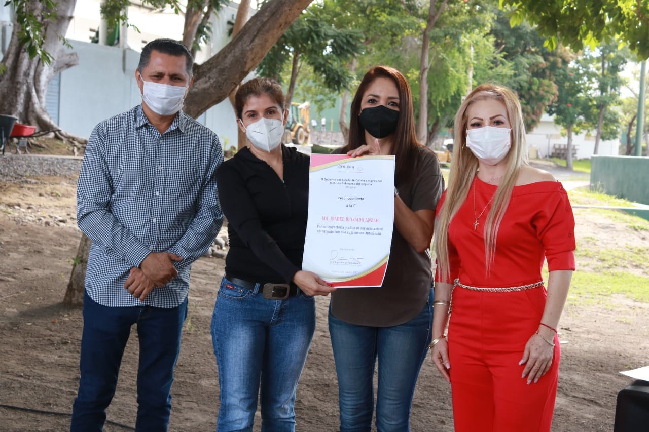 La directora general del Instituto Colimense del Deporte, Ciria Salazar, hizo entrega de reconocimientos a quienes por tantos años sirvieron a esta institución y quienes en esta administración les fueron otorgadas sus jubilaciones. Las y los jubilados son Martín Córdova Calderón, Cruz Moisés Negrete Jiménez, Rubén Ponce Anzar, Delia Cárdenas Torres, Jesús Gutiérrez Alvarado, Mario Enrique Carrillo Lizama, Patricia Alcaraz Pulido, María Isabel Delgado Anzar, Leticia Zepeda Rosales, Benjamín Decena Hernández y Berenice Santana Andrade.