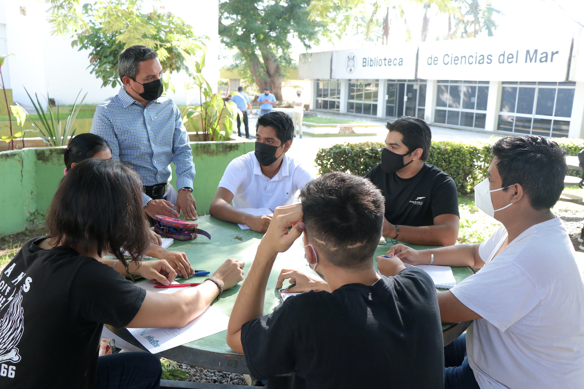 La mañana de este lunes, Christian Jorge Torres Ortiz Zermeño, rector de la Universidad de Colima, visitó los campus El Naranjo y el que se ubica en el Valle de las Garzas, ambos en Manzanillo, para conversar con estudiantes, docentes, administrativos y trabajadores de servicios generales sobre el regreso gradual y presencial a las aulas, sobre los laboratorios y talleres, y para pedirles a todas y todos seguir cuidando los protocolos de seguridad sanitaria con el fin de que pronto más estudiantes puedan regresar a los campus.