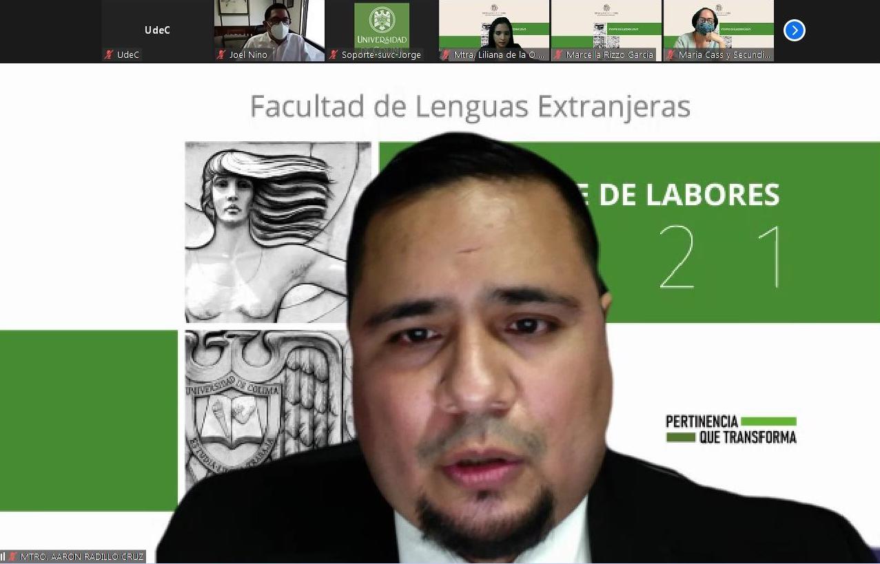 Aaron Radillo Cruz, director de la Facultad de Lenguas Extranjeras (FLEX) de la Universidad de Colima, rindió su informe de labores ante el consejo técnico de su plantel, en el que destacó la mejora de los indicadores de académicos y la implementación del primer Programa de Doble Grado del plantel.