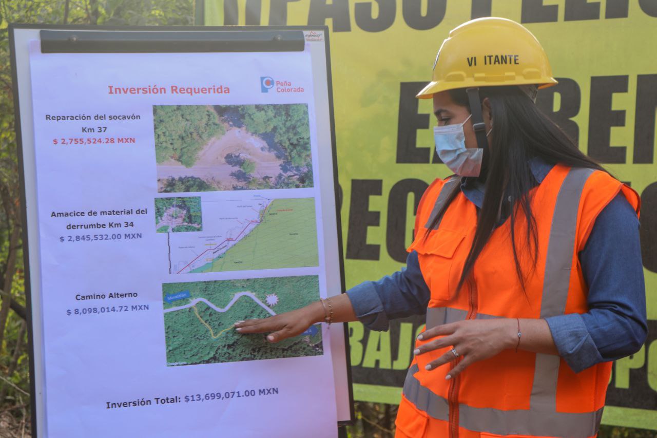 Acompañada de la secretaria de Infraestructura, Desarrollo Urbano y Movilidad Marisol Neri León y el alcalde de Minatitlán, Alejandro Mancilla González, la titular del Ejecutivo escuchó la explicación que dio Arturo Miguel Tronco Guadiana, director general de la empresa, quien dijo que esa obra tendrá una inversión de 13.7 millones de pesos y durará entre 11 y 13 semanas.