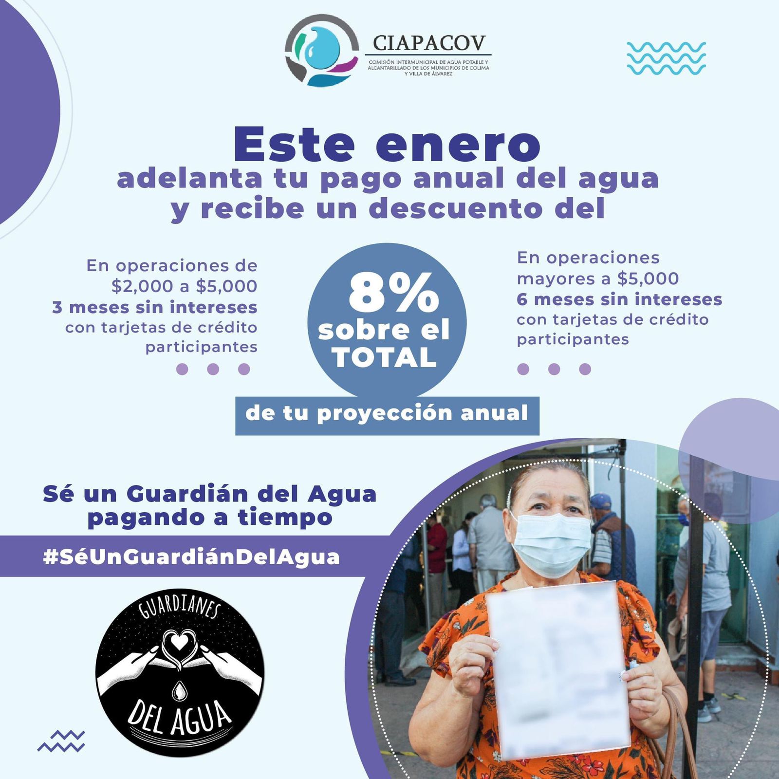 La Comisión de Agua Potable y Alcantarillado de los municipios de Colima y Villa de Álvarez (CIAPACOV) invita a pobladores de ambos municipios, a aprovechar el descuento del 8% en el pago anual anticipado de su servicio de agua potable, durante el mes de Enero. Promoción pensada para agradecer a los usuarios cumplidos por su pago puntual.