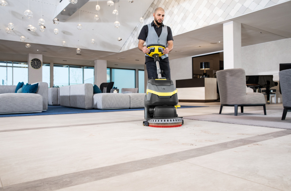 En superficies amplias, la fregadoras-aspiradora son la mejor aliada. La BD 38/12 C Bp Pack de Kärcher, con cabezal de cepillo circular y batería de alto rendimiento, proporciona la potencia necesaria para realizar este tipo de limpieza. Se aconseja utilizar detergentes sin tensoactivos y no dejar humedad que afecte la madera.
