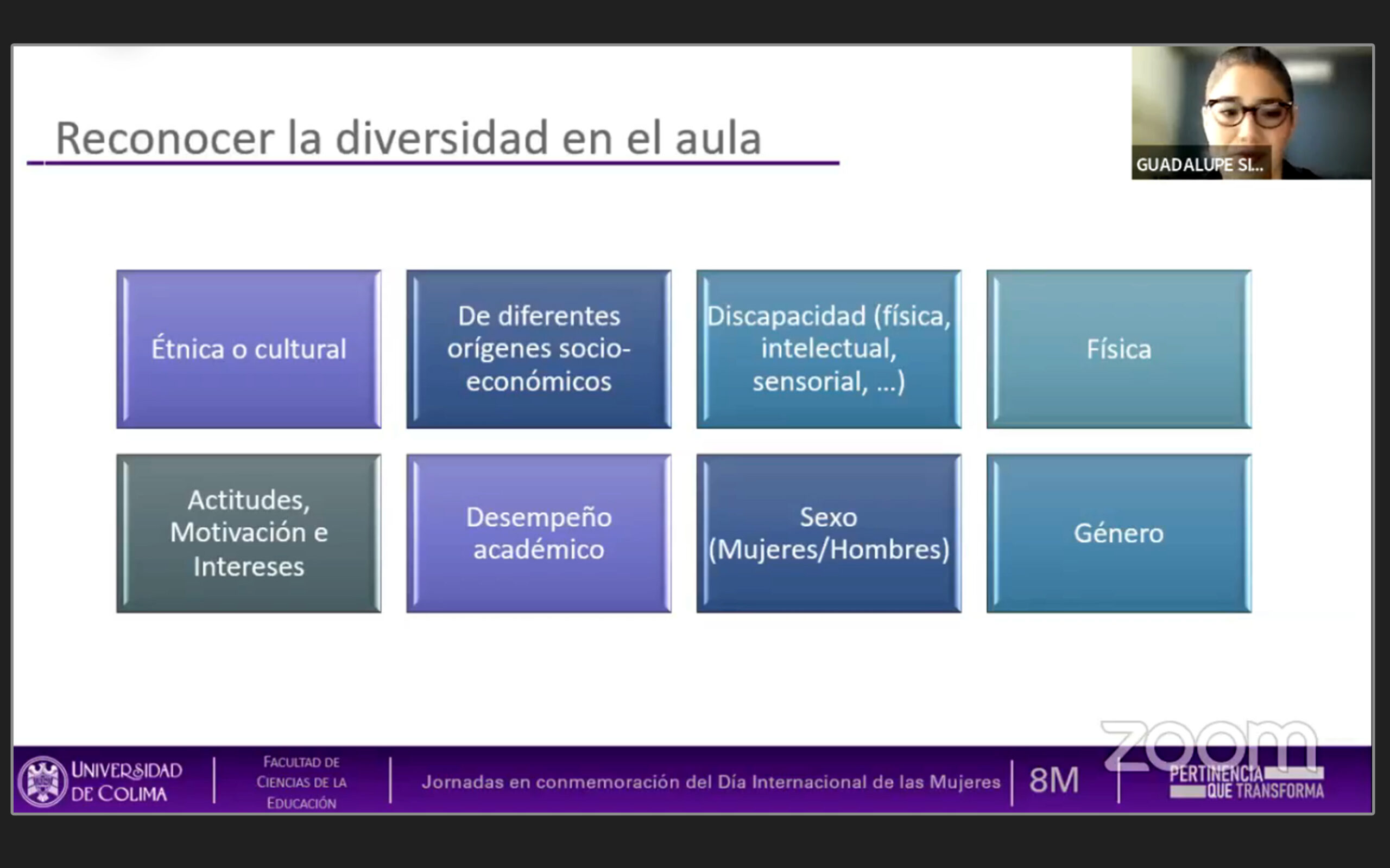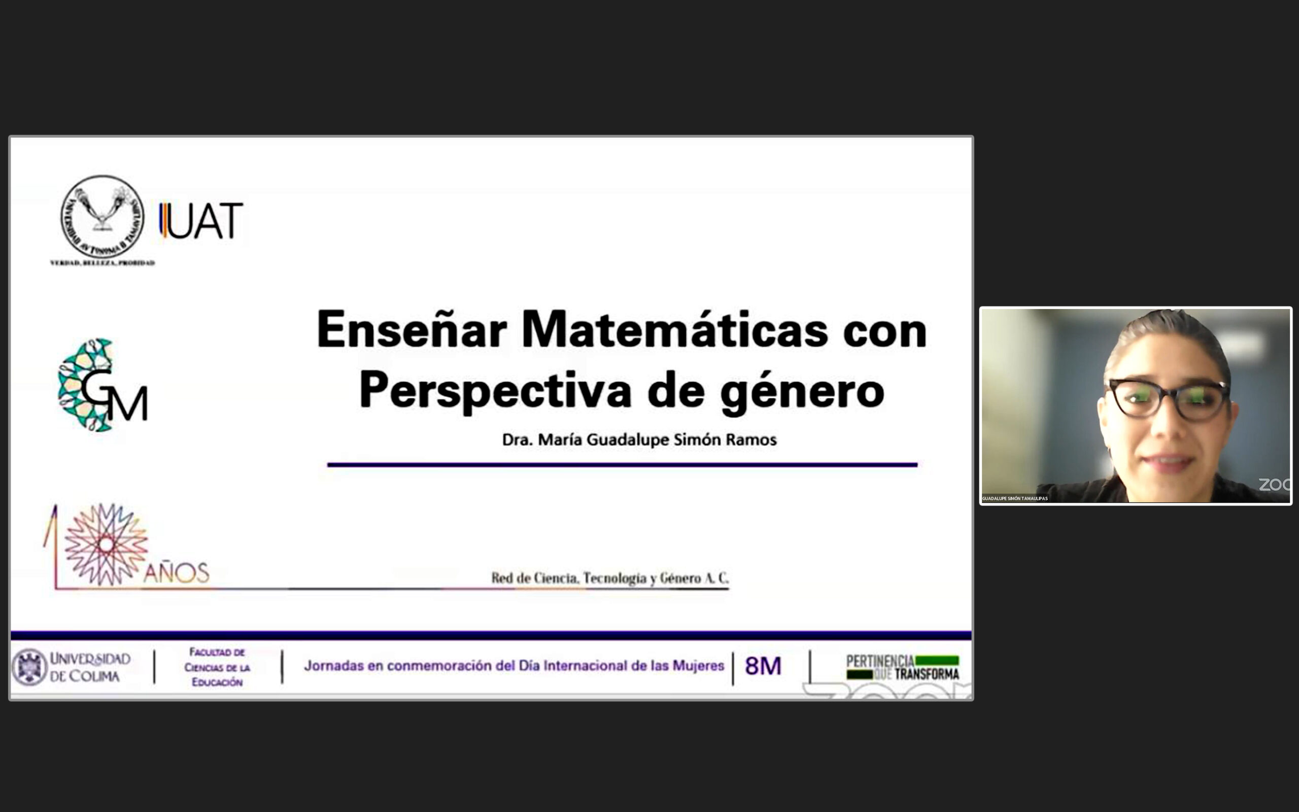 Como parte de las actividades para conmemorar el Día Internacional de la Mujer, la investigadora María Guadalupe Simón Ramos, de la Universidad Autónoma de Tamaulipas, impartió la videoconferencia: “Enseñar matemáticas con perspectiva de género”, a docentes y alumnos de la licenciatura en Matemáticas de la Facultad de Ciencias de la Educación de la Universidad de Colima.