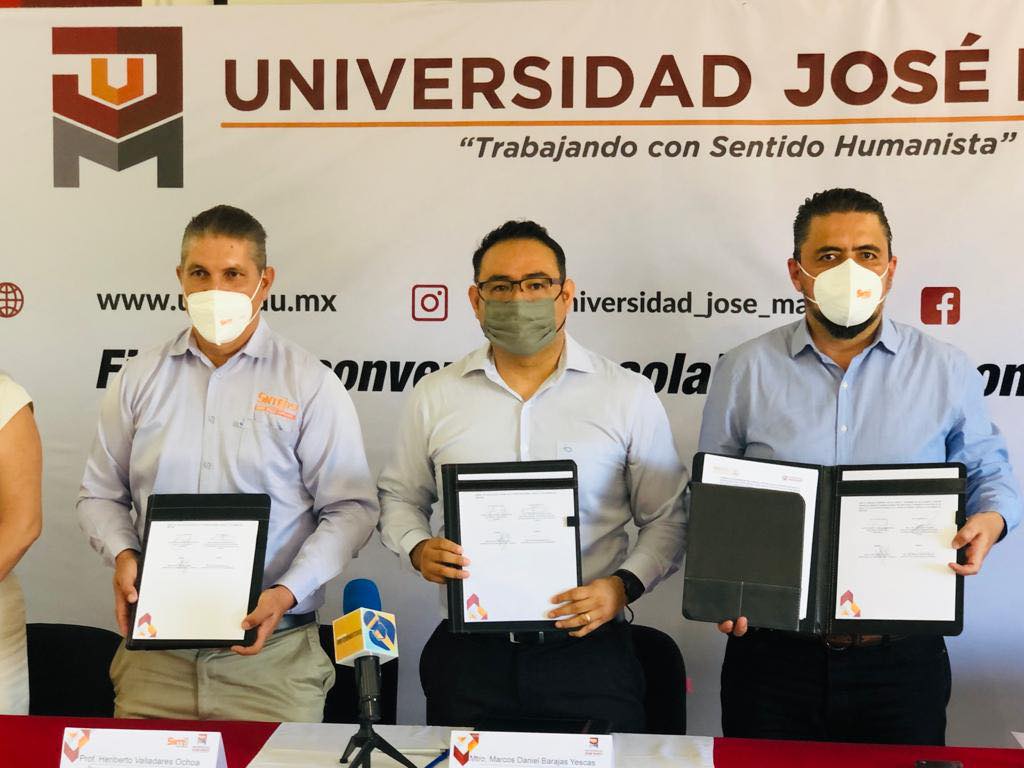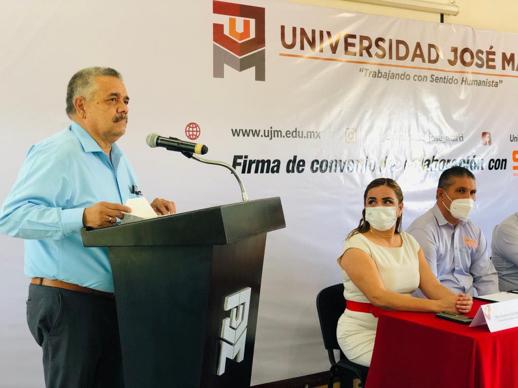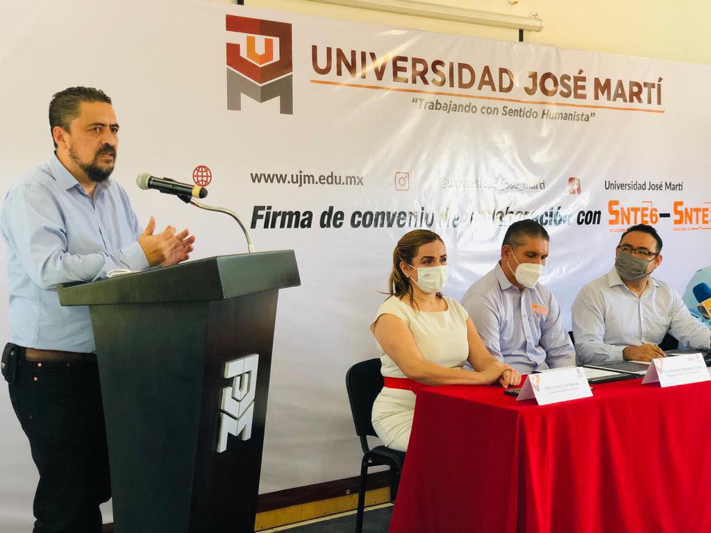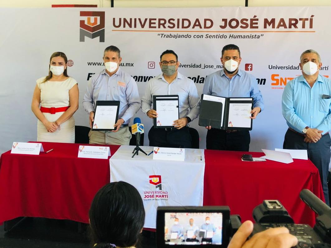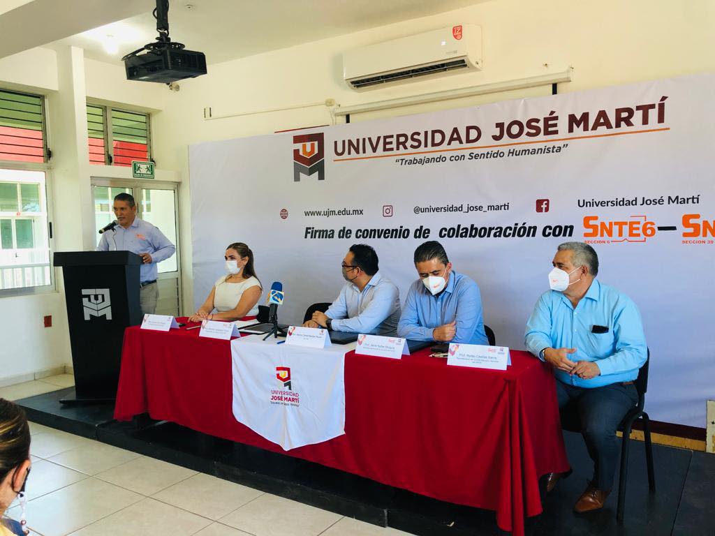 Esta mañana la Universidad José Martí firmó convenio de colaboración con las secciones del Sindicato Nacional de Trabajadores de la Educación el cual favorecerá a todo aquel que desee culminar sus estudios de bachillerato, licenciatura y maestría. En el evento presidieron autoridades de ambas instituciones: Mtro. Marcos Barajas, Rector de la UJM, Mtra. Aurora Cruz, Coordinadora Académica de UJM, Prof. Heriberto Valladares Ochoa, Secretario de la sección 39 del SNTE, Prof. Jaime Nuñez Munguía, Secretario de la sección 6 del SNTE y el Prof. Mateo Casillas Ibarra, Representante del CEN del SNTE.