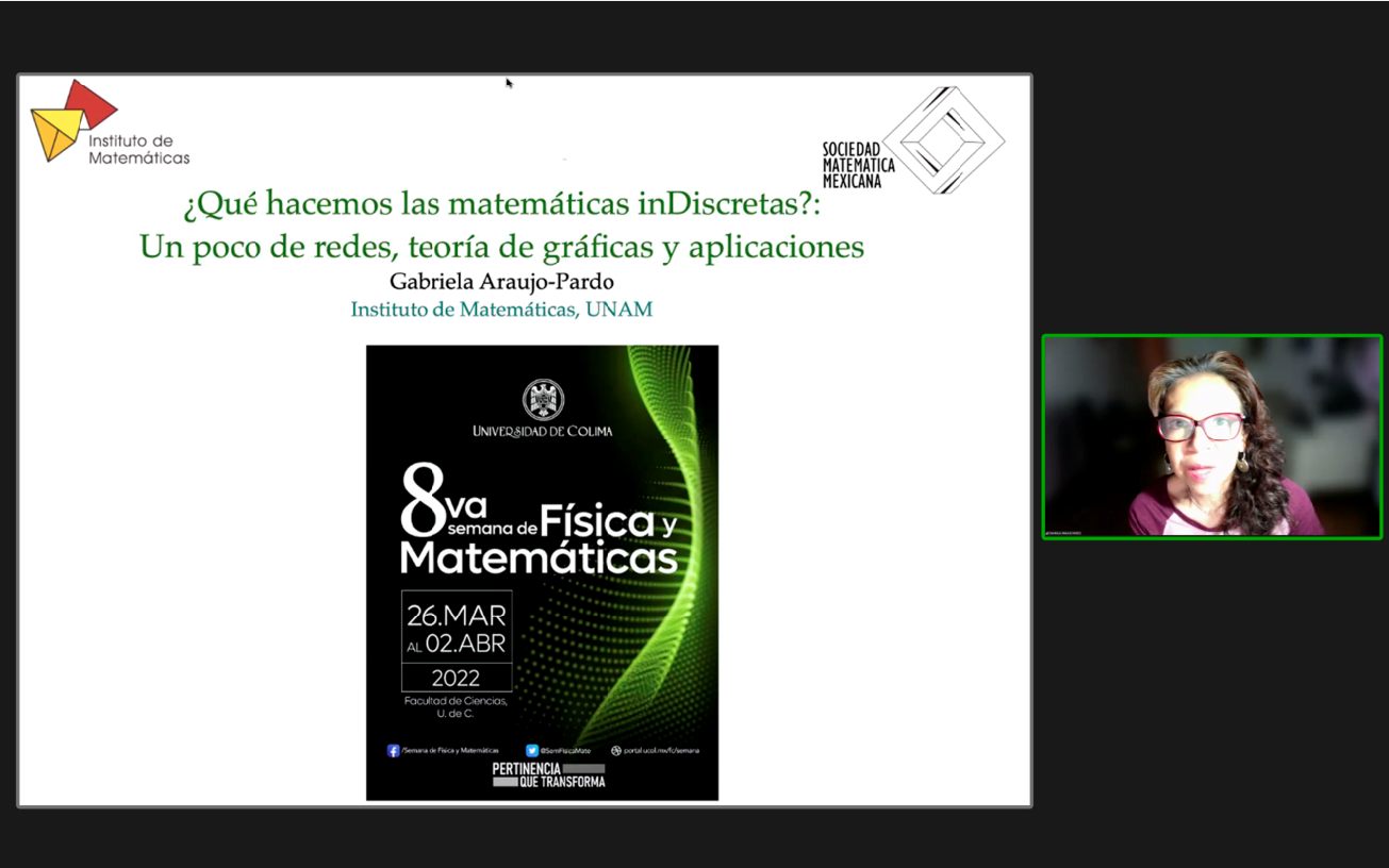 Con la conferencia “¿Qué hacemos las Matemáticas InDiscretas?: un poco de redes, teoría de gráficas y aplicaciones”, dictada por la investigadora del Instituto de Matemáticas de la UNAM y presidenta de la Sociedad Matemática Mexicana, Gabriela Araujo-Pardo, dio inicio la Octava Semana de Física y Matemáticas organizada por la Facultad de Ciencias de la Universidad de Colima con el fin de promover el conocimiento científico de estas disciplinas en un público no especializado, así como en estudiantes de bachillerato.