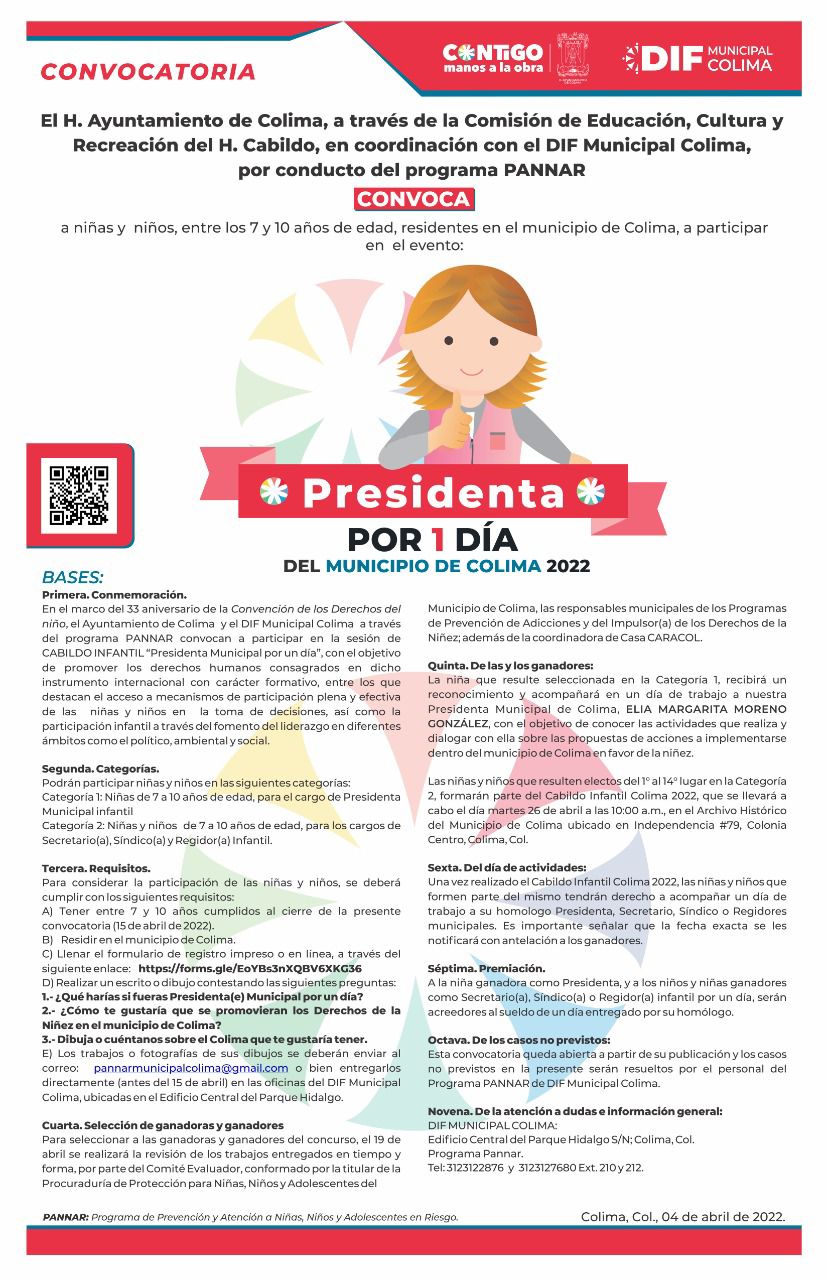 En esta convocatoria se establece que en la Categoría 1 las niñas entre 7 y 10 años de edad, podrán participar para el cargo de Presidenta por un día del municipio de Colima, en tanto que una segunda Categoría, se invita a niñas y niños de la misma edad a participar para los cargos de Secretario (a), Síndico (a) o Regidor (a) Infantil.