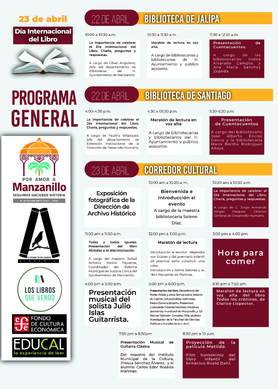 El viernes 22 de abril en la Biblioteca de Jalipa de 10 a 10:30 de la mañana se llevará a cabo una charla sobre “La importancia de celebrar el día internacional del Libro”, esta actividad estará a cargo de César Anguiano, jefe del departamento de Bibliotecas del Ayuntamiento de Manzanillo. De 10:30 a 11:30 se realizará el Maratón de lectura en voz alta y de 11:30 a 12:20 del día la presentación de Cuenta-Cuentos. Ese mismo día, pero en la Biblioteca de Santiago desde las 4 de la tarde se replicarán las mismas actividades.