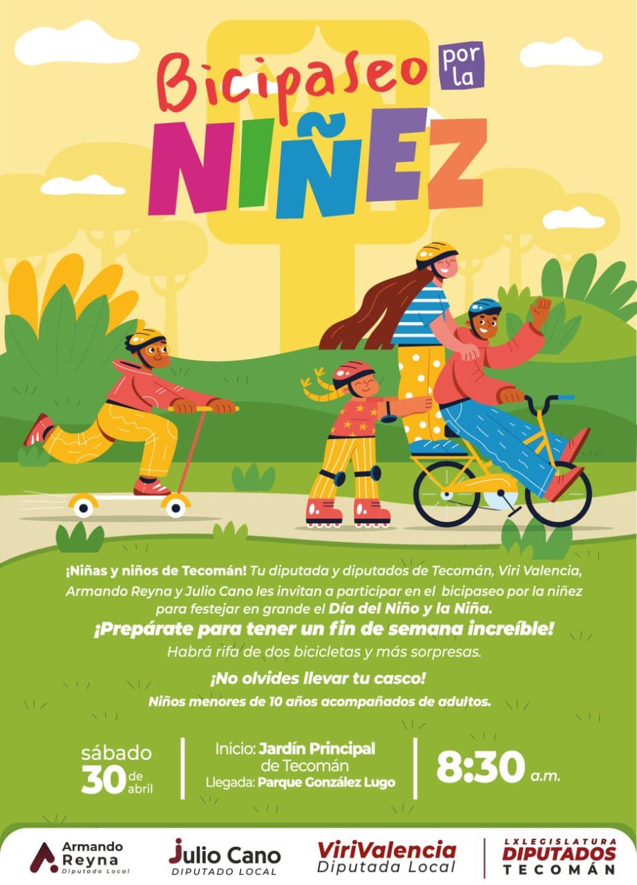 La diputada Viridiana Valencia, así como los diputados Armando Reyna y Julio Cano invitan al “Bicipaseo por la Niñez”, evento de convivencia familiar que se realizará este sábado 30 de abril, a partir de las 8:30 de la mañana, cuyo punto de partida será el jardín principal de Tecomán, teniendo como llegada el parque González Lugo.