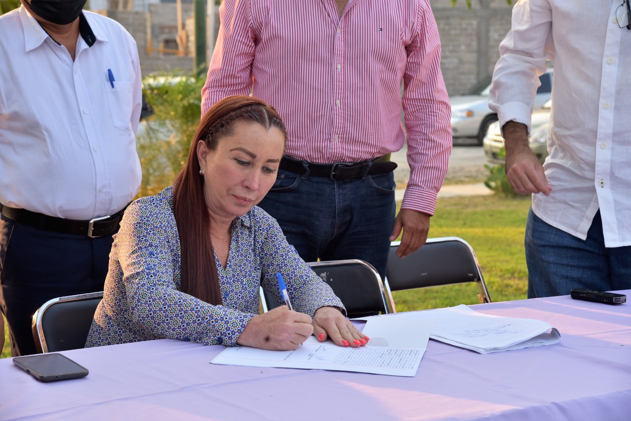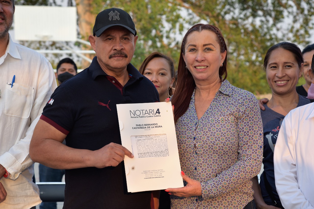 Villa de Álvarez, Col.- Ante vecinas y vecinos de la colonia Las Presas, la Presidenta Municipal Tey Gutiérrez y el Síndico José Santos Dolores, firmaron las escrituras que acreditan son prioridad del Ayuntamiento de Villa de Álvarez, los terrenos de uso común de ese asentamiento.