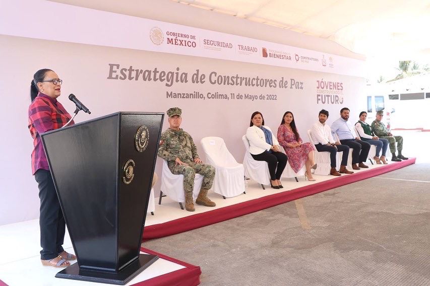 “El Gobierno de México viene hoy a Manzanillo para respaldar la estrategia de seguridad en el estado de Colima, con impulso al programa Jóvenes Construyendo el Futuro”, manifestó la secretaria de Seguridad y Protección Ciudadana del gobierno federal, Rosa Icela Rodríguez Velázquez, en su gira de este miércoles por la entidad, donde junto con la gobernadora, Indira Vizcaíno Silva, encabezaron la presentación de la estrategia Constructores de Paz e inauguraron oficinas móviles del referido programa, en un acto realizado en la Sexta Región Naval.