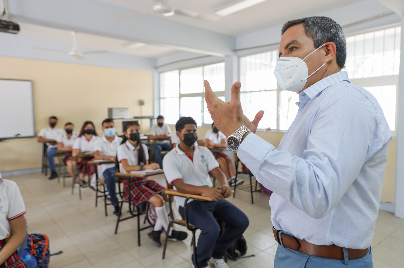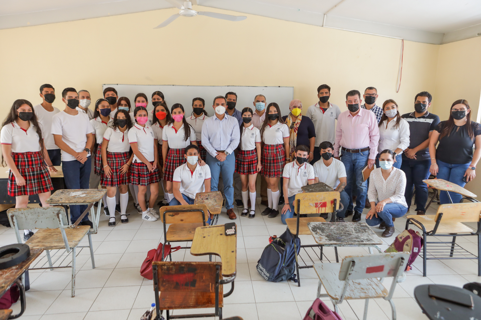 En la visita estuvo acompañado por el delegado de Villa de Álvarez, Adrián López Virgen; por Martín Jesús Robles de Anda, director general de Educación Media Superior; Luz María Urzúa Escamilla, directora general de Recursos Materiales y por Francisco Coello Aguilar.