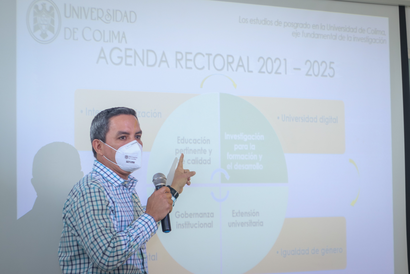 Comentó que como parte de su gestión rectoral propuso trabajar en la investigación para la formación y el desarrollo, así como en una educación pertinente y de calidad, “lo cual va a convocar naturalmente una gran reflexión con investigadores e investigadoras, centros de investigación y facultades, en la que se deberá revisar qué pasa hoy en día con los programas que ofrecemos, tanto en pregrado como en posgrado”.