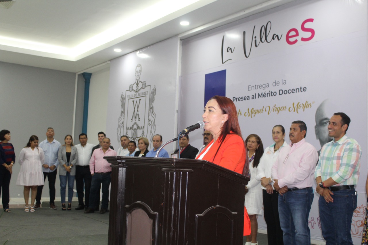 En la entrega de la Presea al Mérito Docente 2022 “Profr. Miguel Virgen Morfín”, la Presidenta Municipal Tey Gutiérrez Andrade mencionó que ese reconocimiento honra a maestras y maestros que logran con su trabajo impactar en su comunidad.