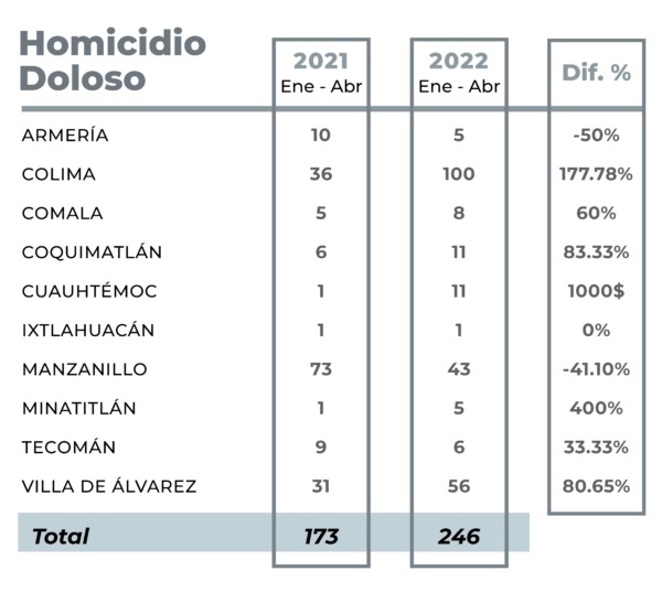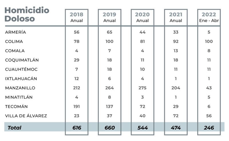 En su plataforma, esta organización civil reporta que, de enero a abril del 2022, en el Estado de Colima se han iniciado 246 carpetas de investigación por homicidios dolosos, dejando al estado con una tasa de 30.40 homicidios por cada 100 mil habitantes. En comparación con el mismo periodo del año pasado, la suma total de este delito aumentó en un 42.20%, de acuerdo con cifras del Secretariado Ejecutivo del Sistema Nacional de Seguridad Pública, actualizadas al mes de abril.