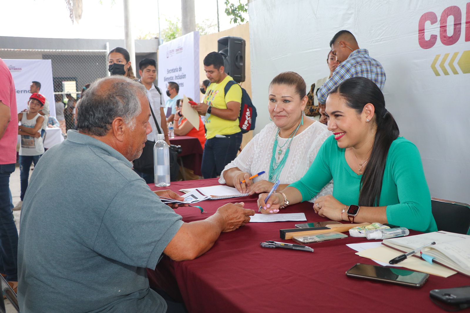 Indira Vizcaíno estuvo acompañada por la delegada de Programas para el Bienestar, Viridiana Valencia Vargas; la presidenta municipal de Coquimatlán, Leonor Alcaraz Manzo; Perla Prado Pérez, representante del fiscal general del Estado, Bryant García Ramírez; la diputada local, Myriam Gudiño Espíndola, así como servidoras y servidores públicos de los tres niveles de gobierno.
