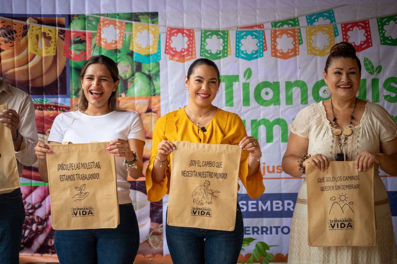 Gerzaín Zamora López, coordinador territorial de Sembrando Vida en la entidad, expuso que se trata de un programa prioritario del Gobierno de México, que tiene dos objetivos fundamentales: combatir la pobreza rural y el mejoramiento ambiental; “hoy estamos promoviendo un comercio justo y directamente de los sembradores hacia los consumidores”, dijo el servidor público, quien obsequió bolsas ecológicas para que las y los asistentes puedan comprar en este tianguis.