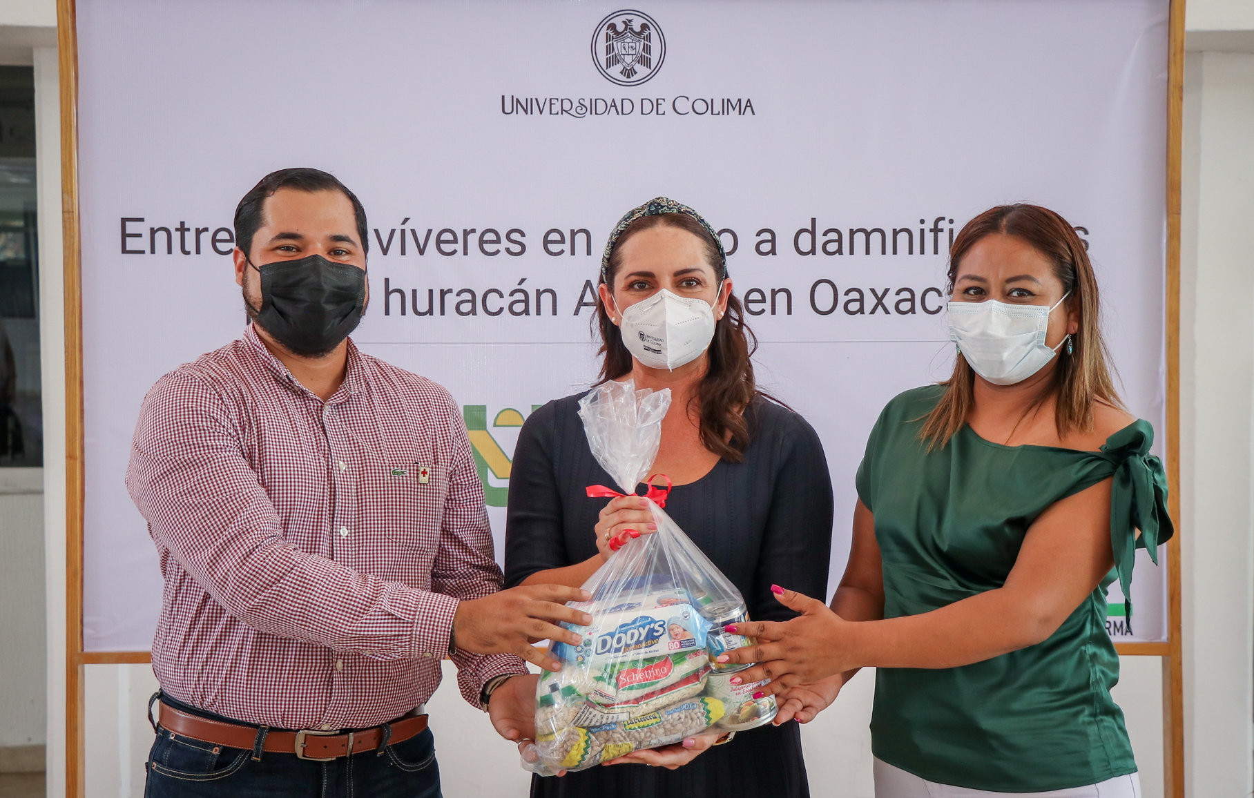 La tarde de este jueves la presidenta del Voluntariado de la Universidad de Colima, Blanca Liliana Díaz Vázquez, entregó cinco toneladas de víveres al DIF Estatal Colima, que preside Arnoldo Vizcaíno Silva, como resultado de la colecta que durante cinco días se realizó en la sala anexa al Paraninfo, para apoyar a damnificados por el huracán Agatha en Oaxaca.