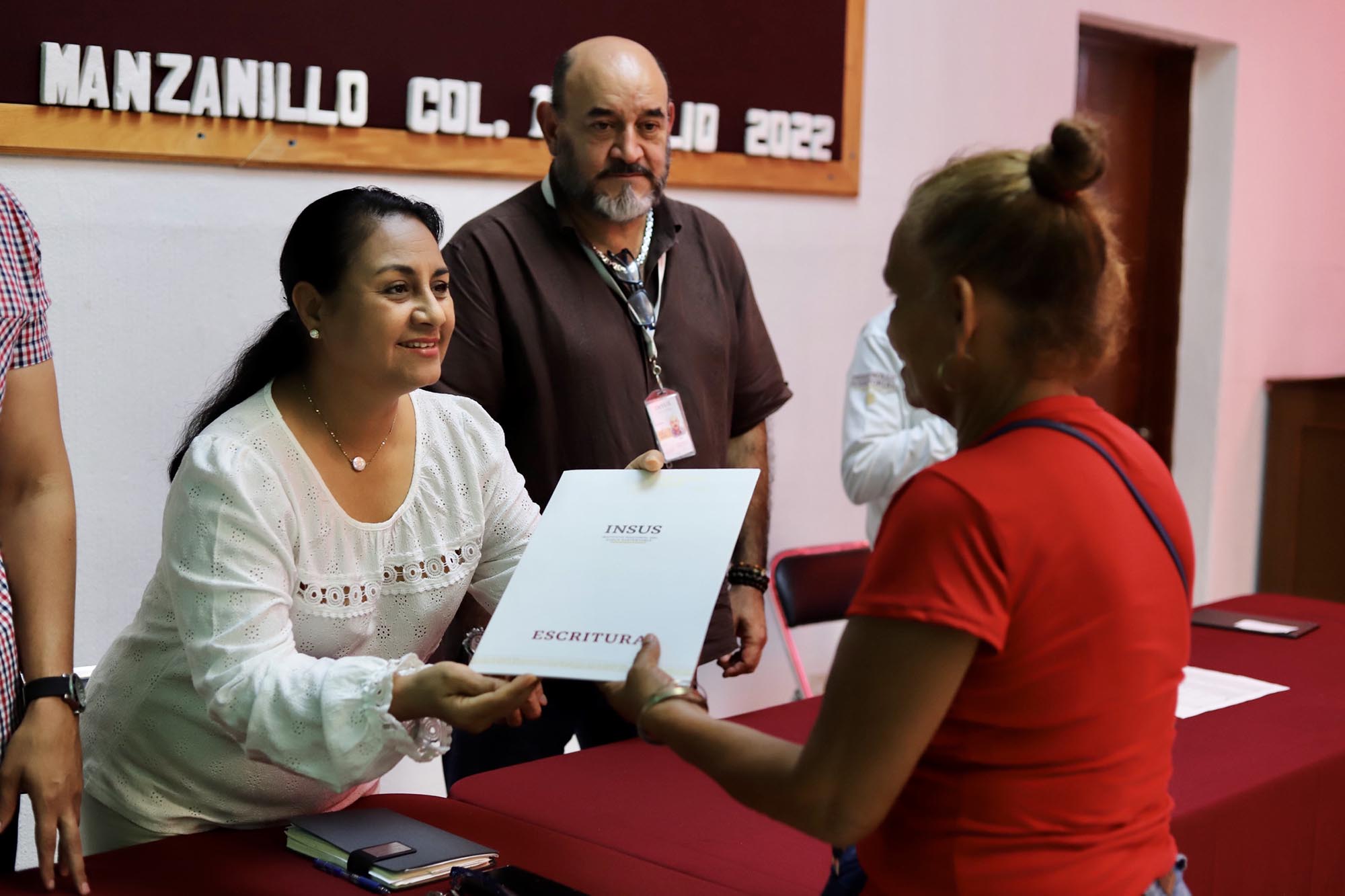 La presidenta de Manzanillo Griselda Martínez, junto con el coordinador regional del Instituto Nacional de Suelo Sustentable (INSUS) para Colima, Jalisco, Nayarit y Michoacán Ernesto Padilla Aceves hicieron la entrega de 35 escrituras a igual número de familias, de un universo de 832, con lo que ahora tendrán certeza jurídica de sus hogares.