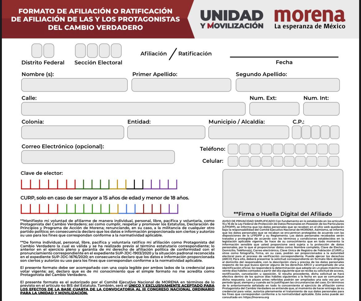 Quienes deseen participar en las asambleas de este sábado, deberán llevar credencial de elector vigente y copia de la misma, su formato de solicitud o ratificación de afiliación disponible en www.morena.org. En caso de ser adolescentes de 15 a 17 tendrán que presentarse con CURP, formato e identificación con fotografía.