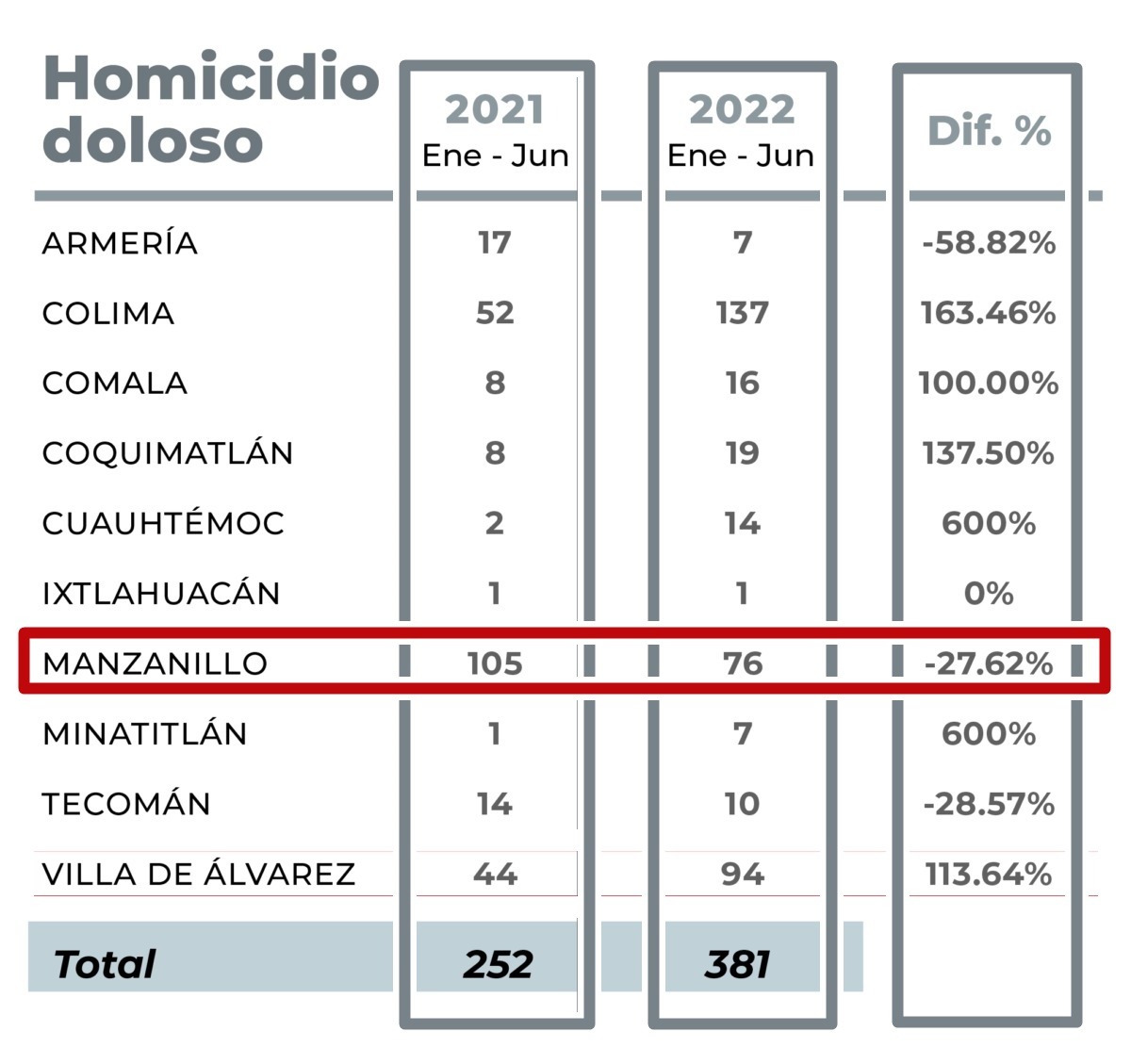 Las cifras obtenidas por el Secretariado Ejecutivo del Sistema Nacional de Seguridad Pública, en el primer semestre de 2021, Manzanillo tenía un 74.1 por ciento respecto a los casos de homicidios dolosos, y que al cierre del primer semestre de 2022 bajó a 68.2 por ciento; es decir, que en la comparativa, pasaron de 105 hechos a 76.