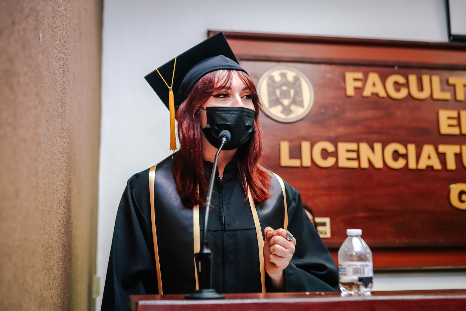 En nombre de los egresados, Sofía Castillo agradeció a la FLEX “la oportunidad de crecer no sólo como persona y estudiante, sino como profesionista; un día nos encontrábamos en nuestra primera clase y hoy celebramos la culminación de nuestra carrera”.