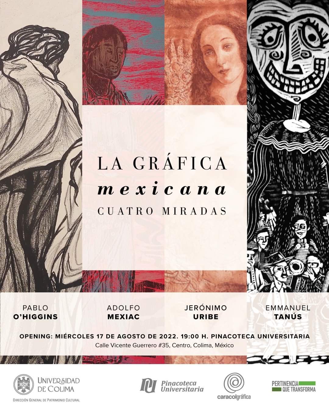 Este miércoles 17 de agosto a las 19:00 horas, en la Pinacoteca Universitaria, se llevará a cabo la inauguración de la exposición ” La gráfica mexicana. Cuatro miradas” que realiza la empresa cultural Caracol Gráfica en coordinación con la Universidad de Colima; presentando el trabajo de maestros grabadores de distintas generaciones: Pablo OHiggins, Adolfo Mexiac, Jerónimo Uribe y Emmanuel Tanús.